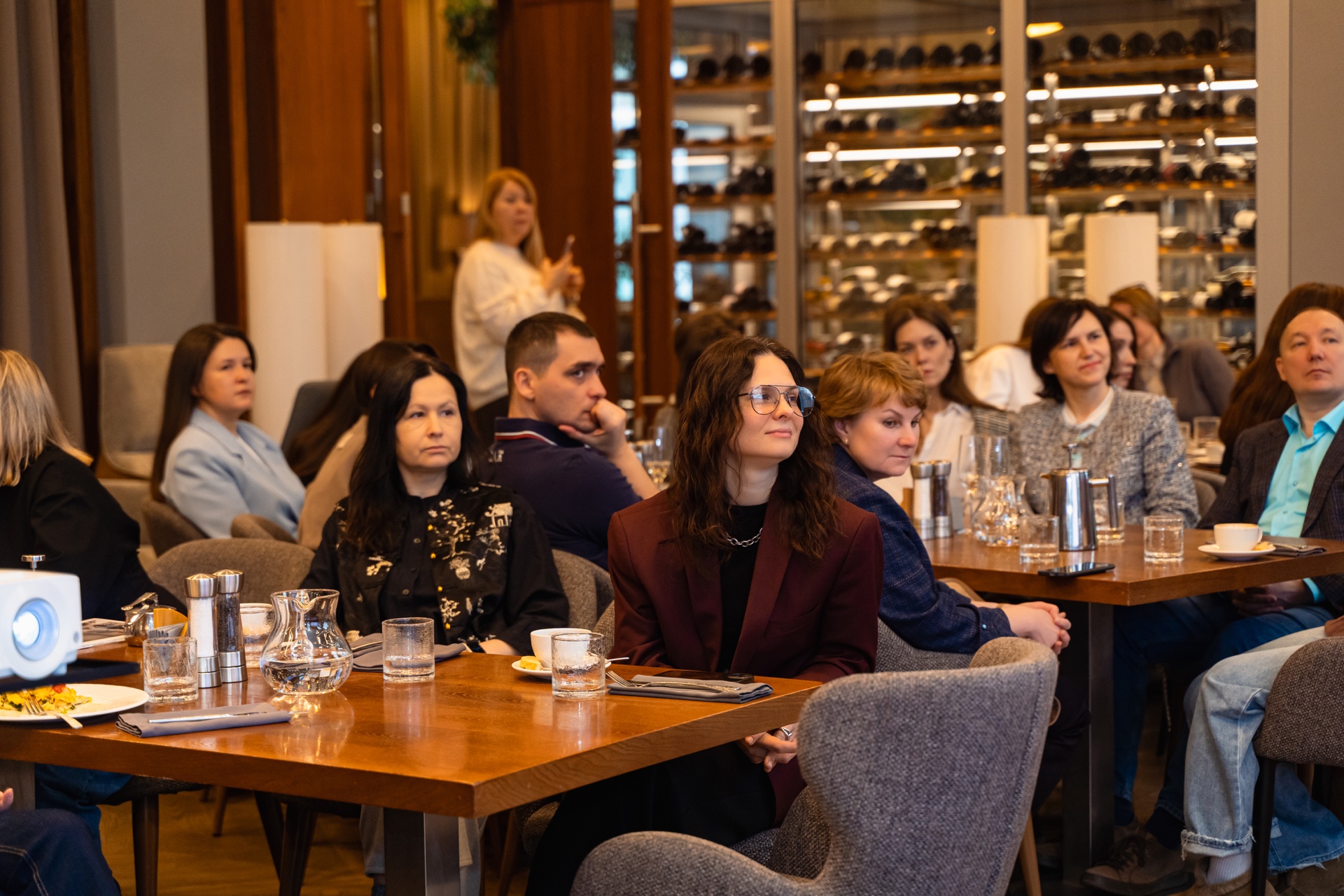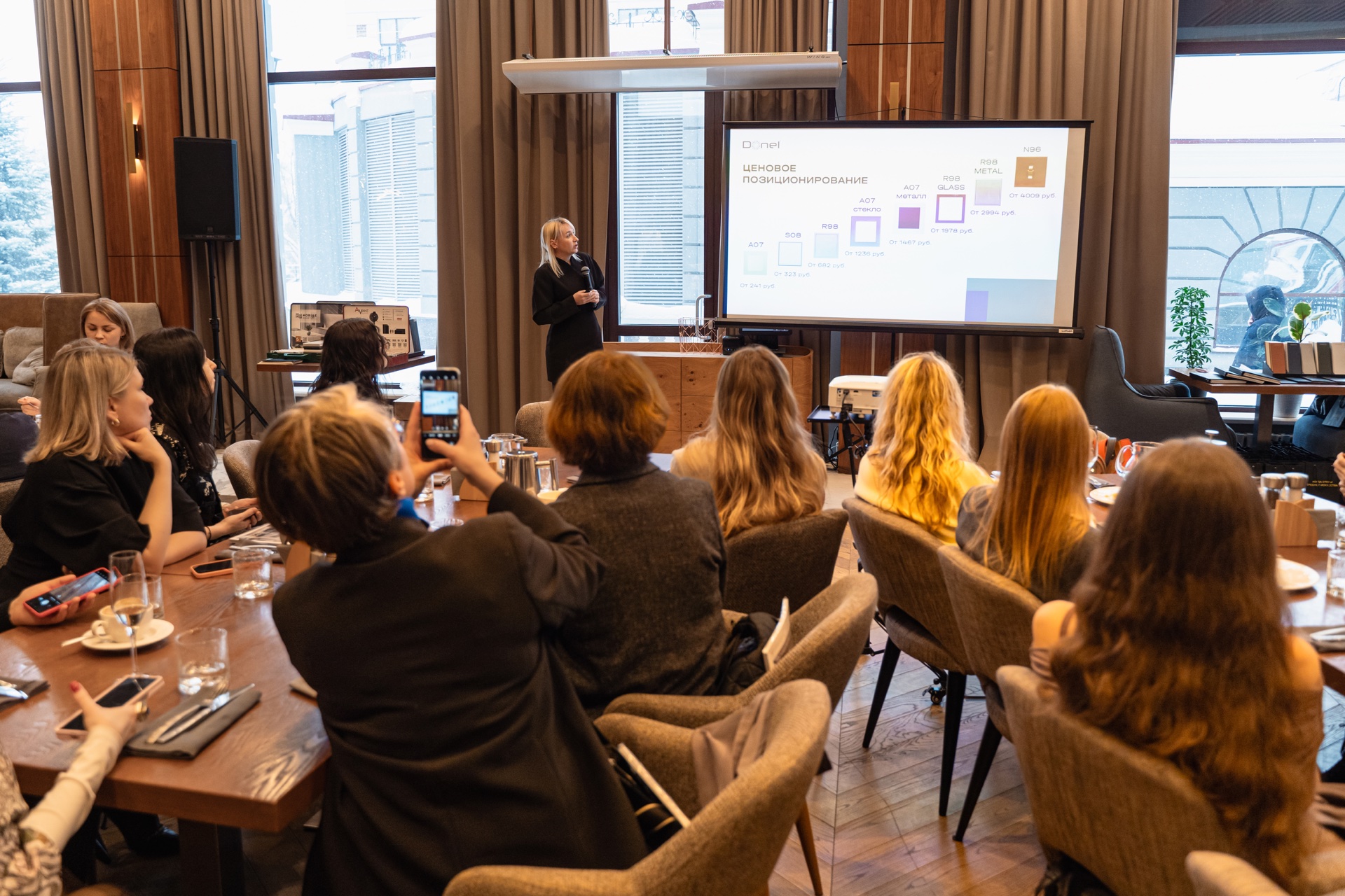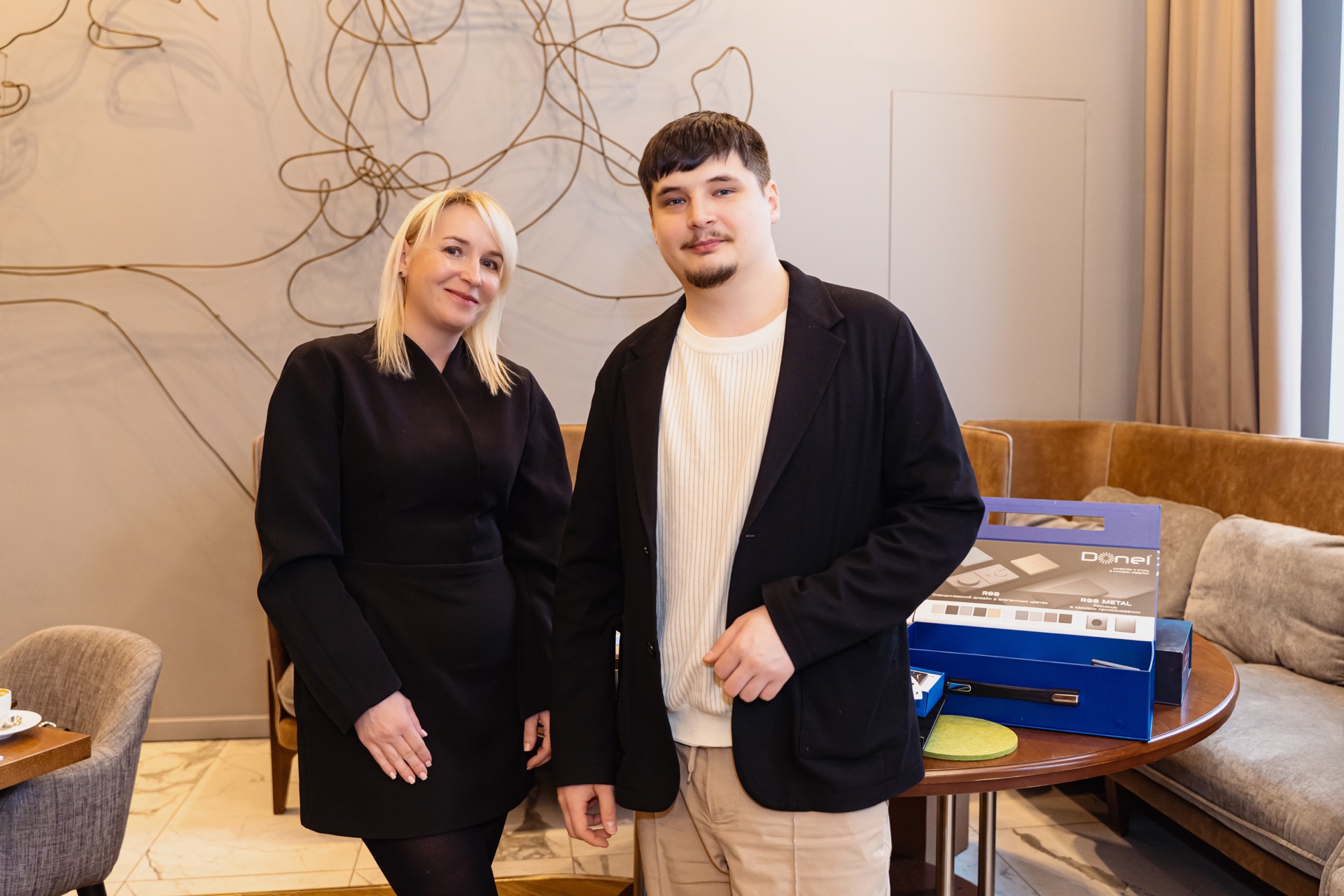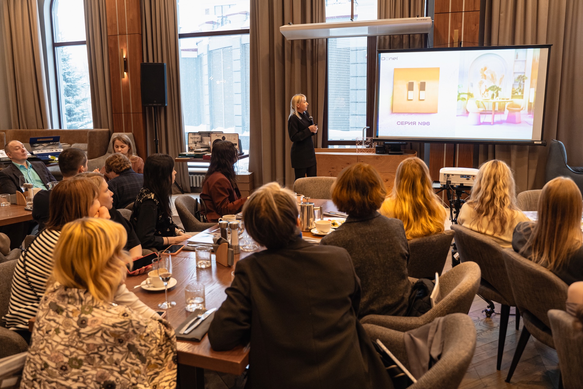 Встреча производителей и дистрибьюторов с дизайнерами прошла в стильном конференц-зале ресторана Gavi. От екатеринбургского филиала ГЭС выступил ведущий специалист по работе с дизайнерами, представив новинку 2026 года - тумблерные выключатели серии R98 METAL, а также электроустановочные изделия Vanguard Valero, A07, S08 и светильники серии Munich.