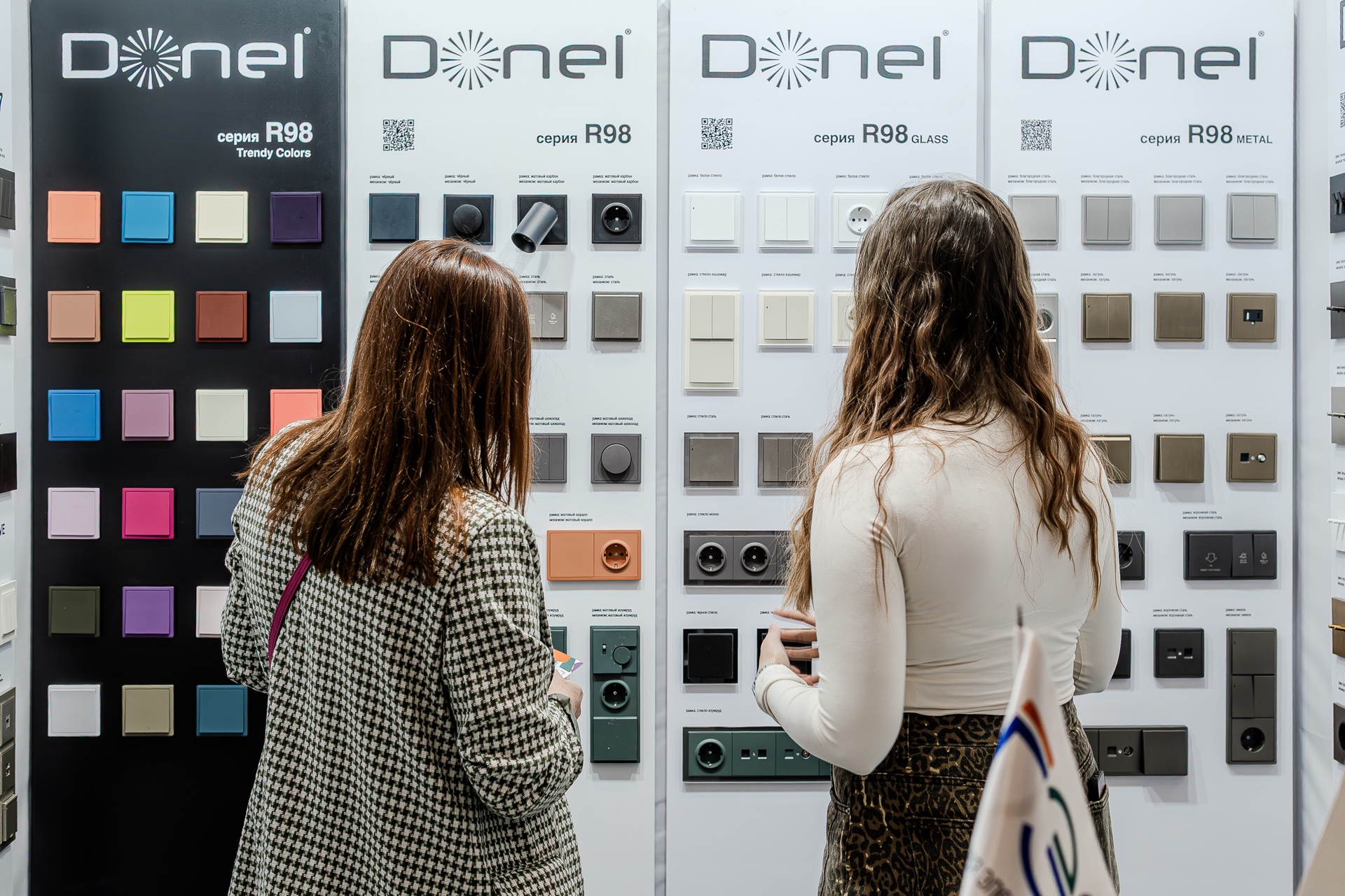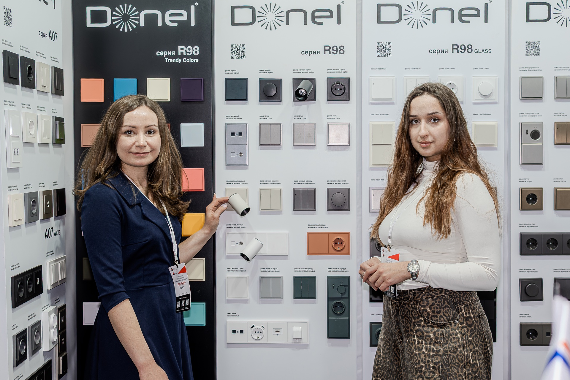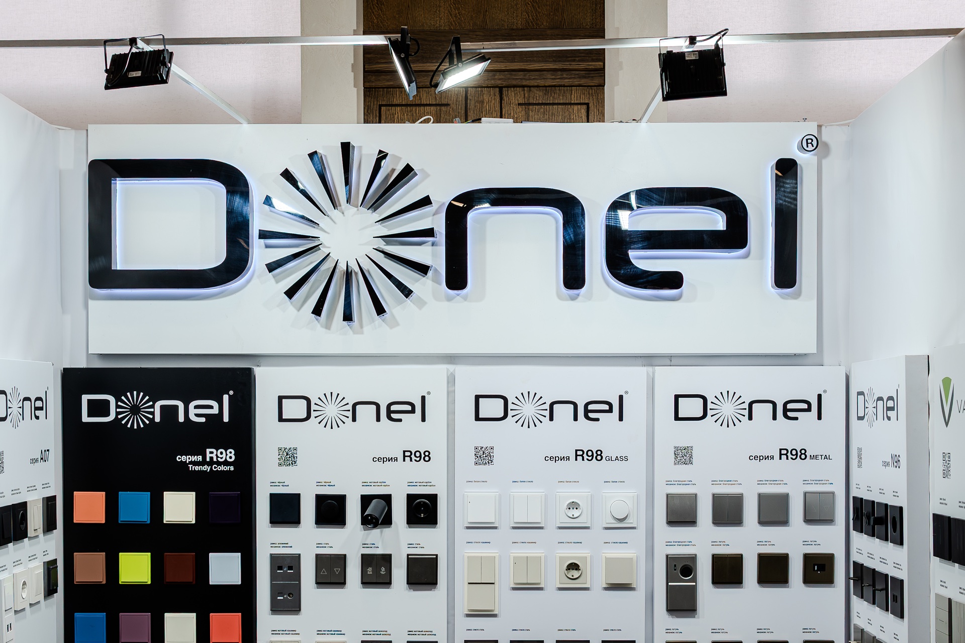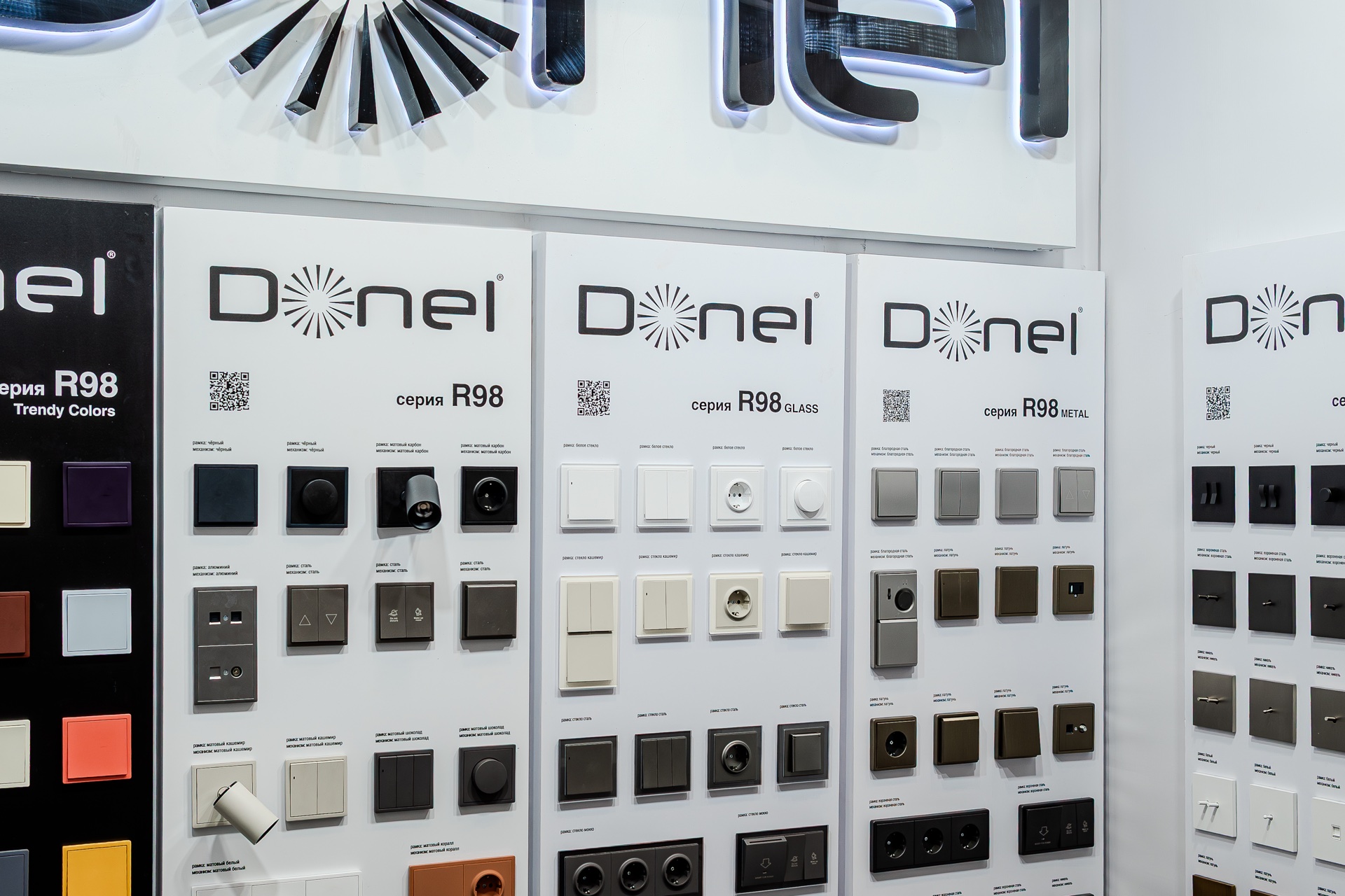 На нашем стенде были представлены актуальные серии электротехнического бренда Donel: полюбившаяся дизайнерам серия R98, включая новинку — тумблерные выключатели R98 Metal, свежие цветовые решения и усовершенствованные механизмы для серий А07 и S08, серия N96 в ретро-стиле, 24 актуальных оттенка линейки Trendy Colors, а также электроустановочные изделия VGD.