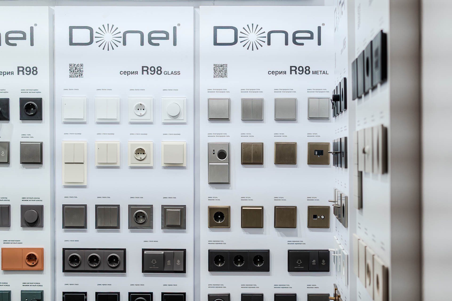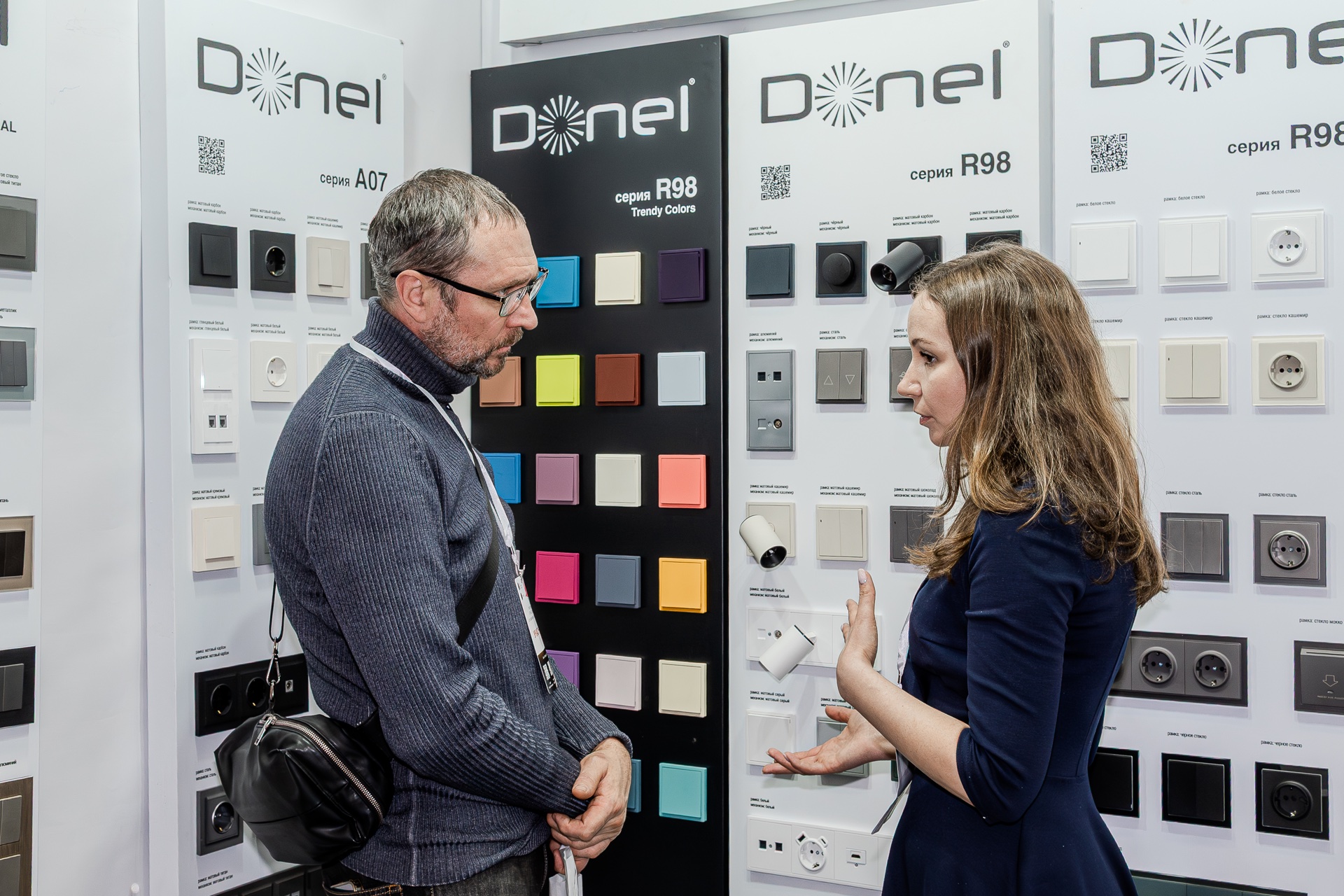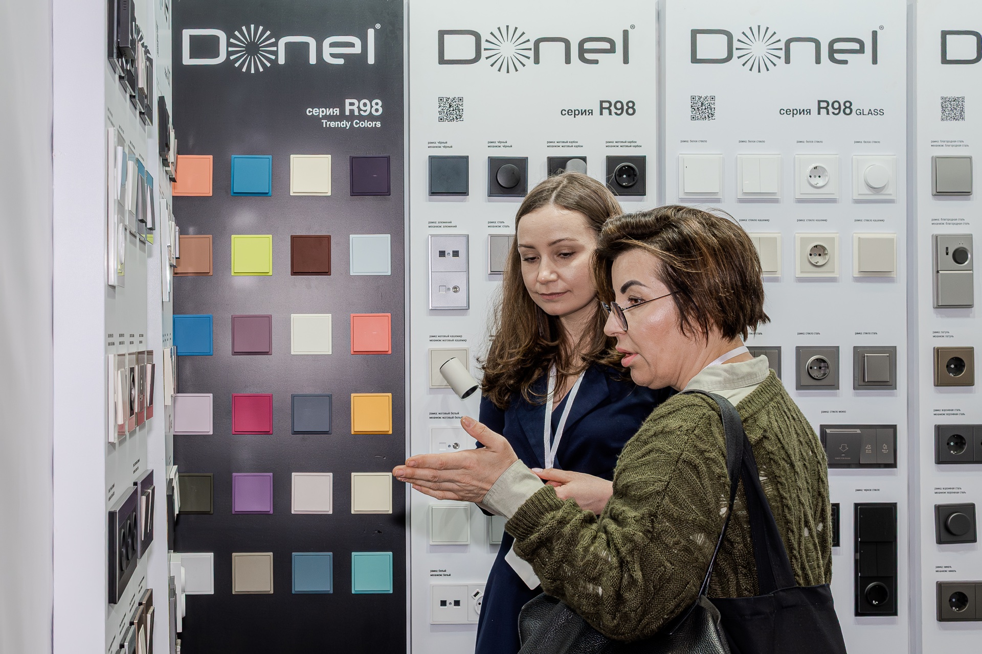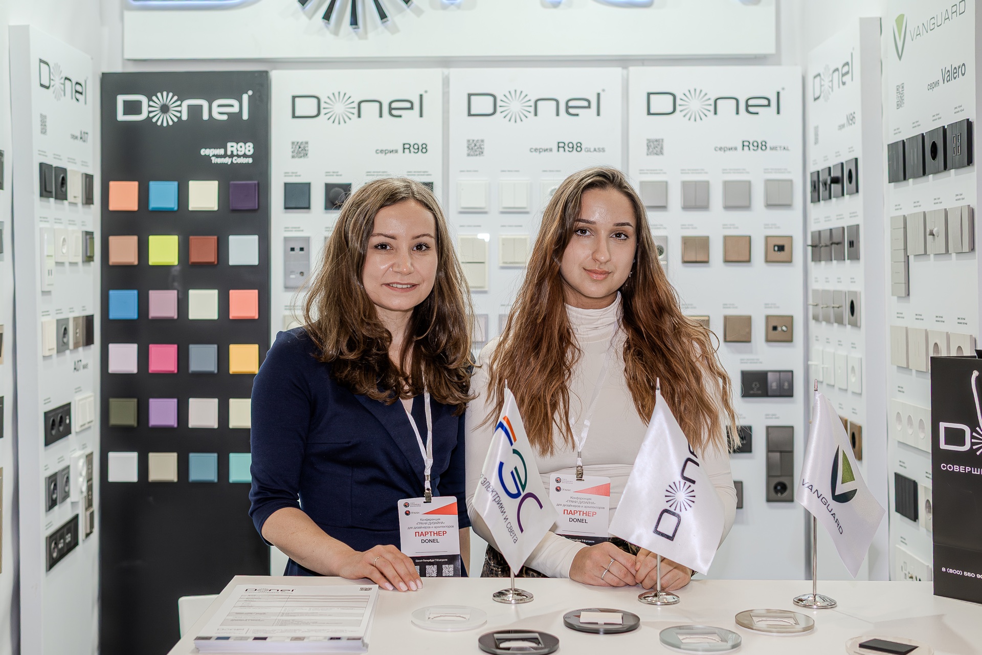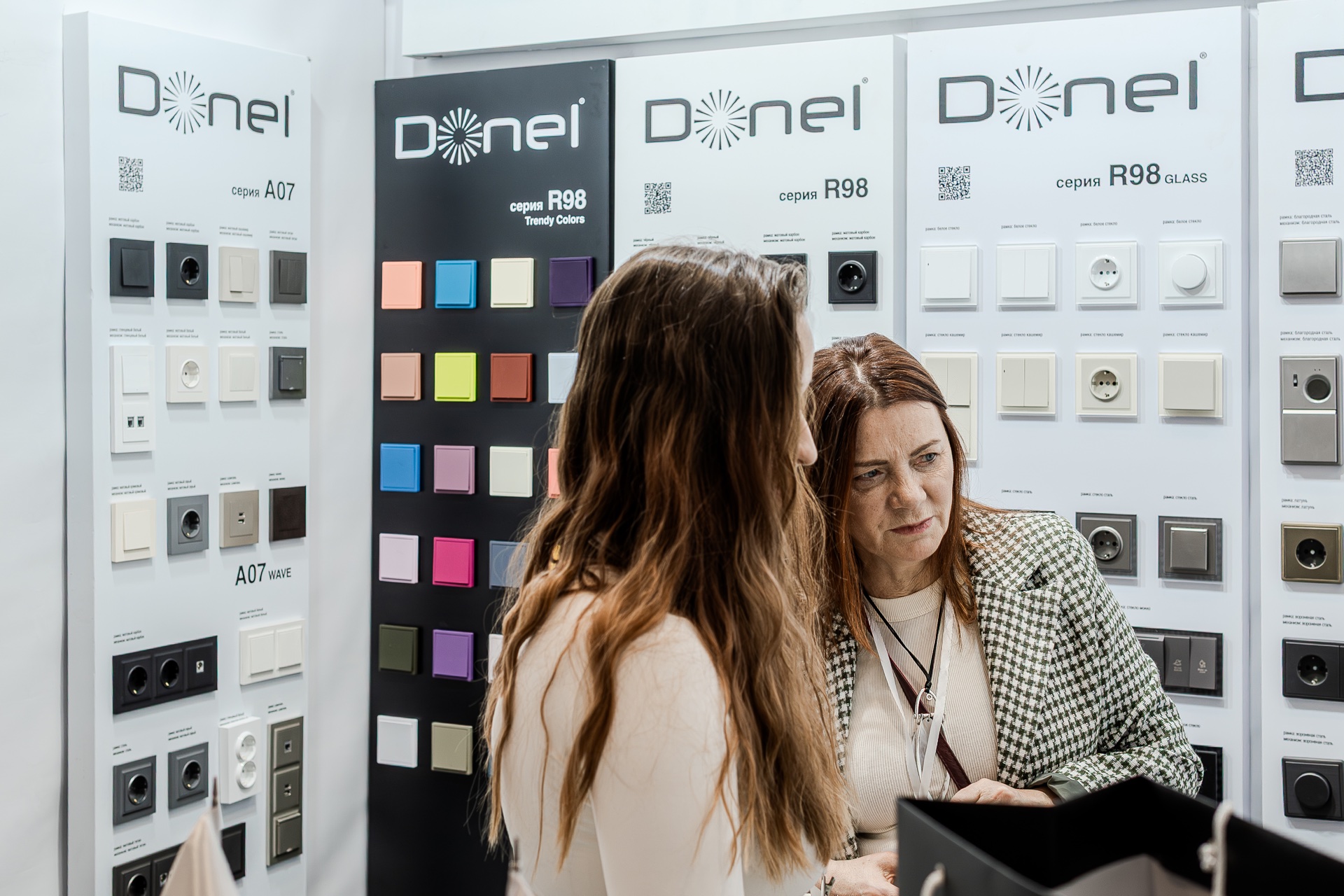На нашем стенде были представлены актуальные серии электротехнического бренда Donel: полюбившаяся дизайнерам серия R98, включая новинку — тумблерные выключатели R98 Metal, свежие цветовые решения и усовершенствованные механизмы для серий А07 и S08, серия N96 в ретро-стиле, 24 актуальных оттенка линейки Trendy Colors, а также электроустановочные изделия VGD.