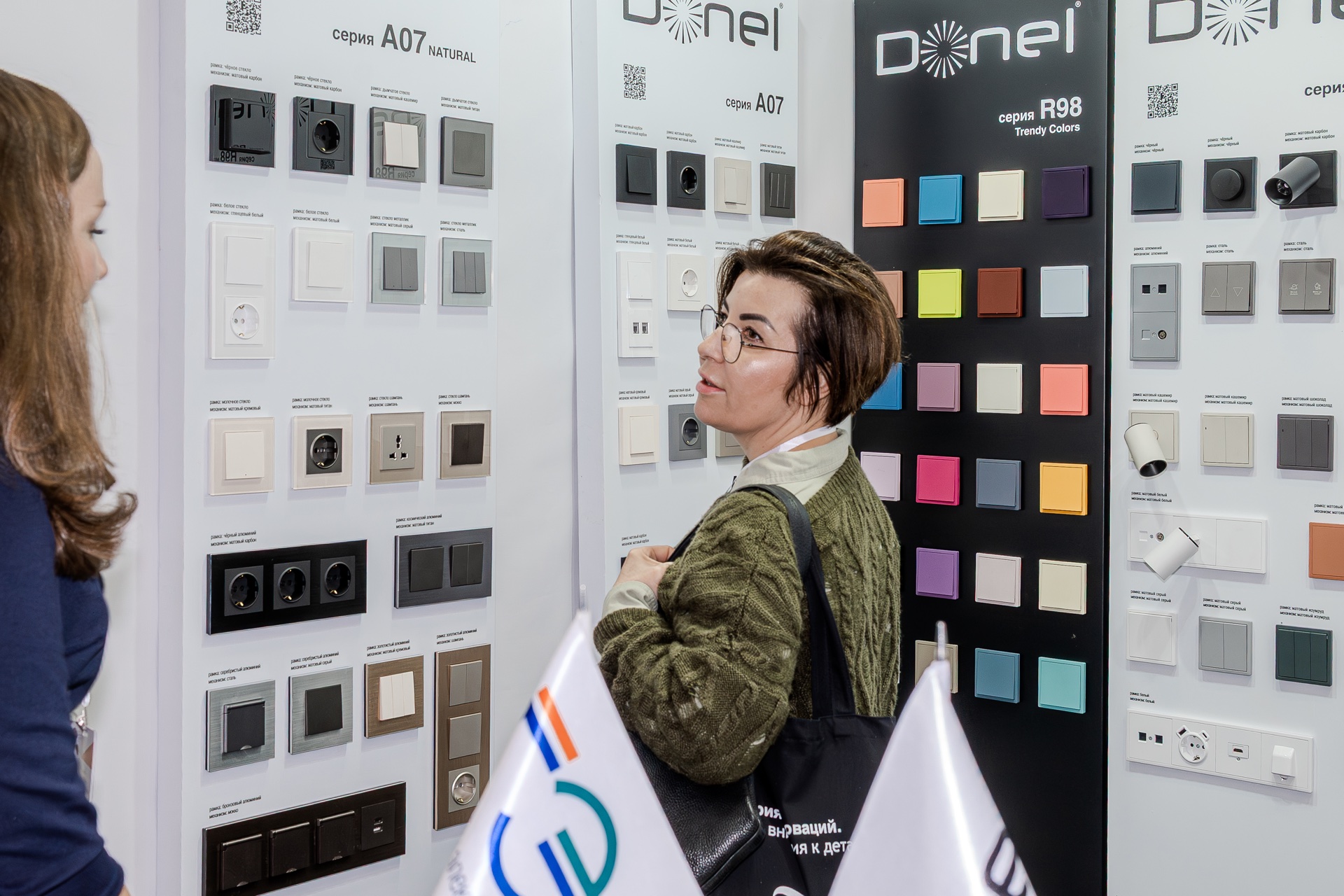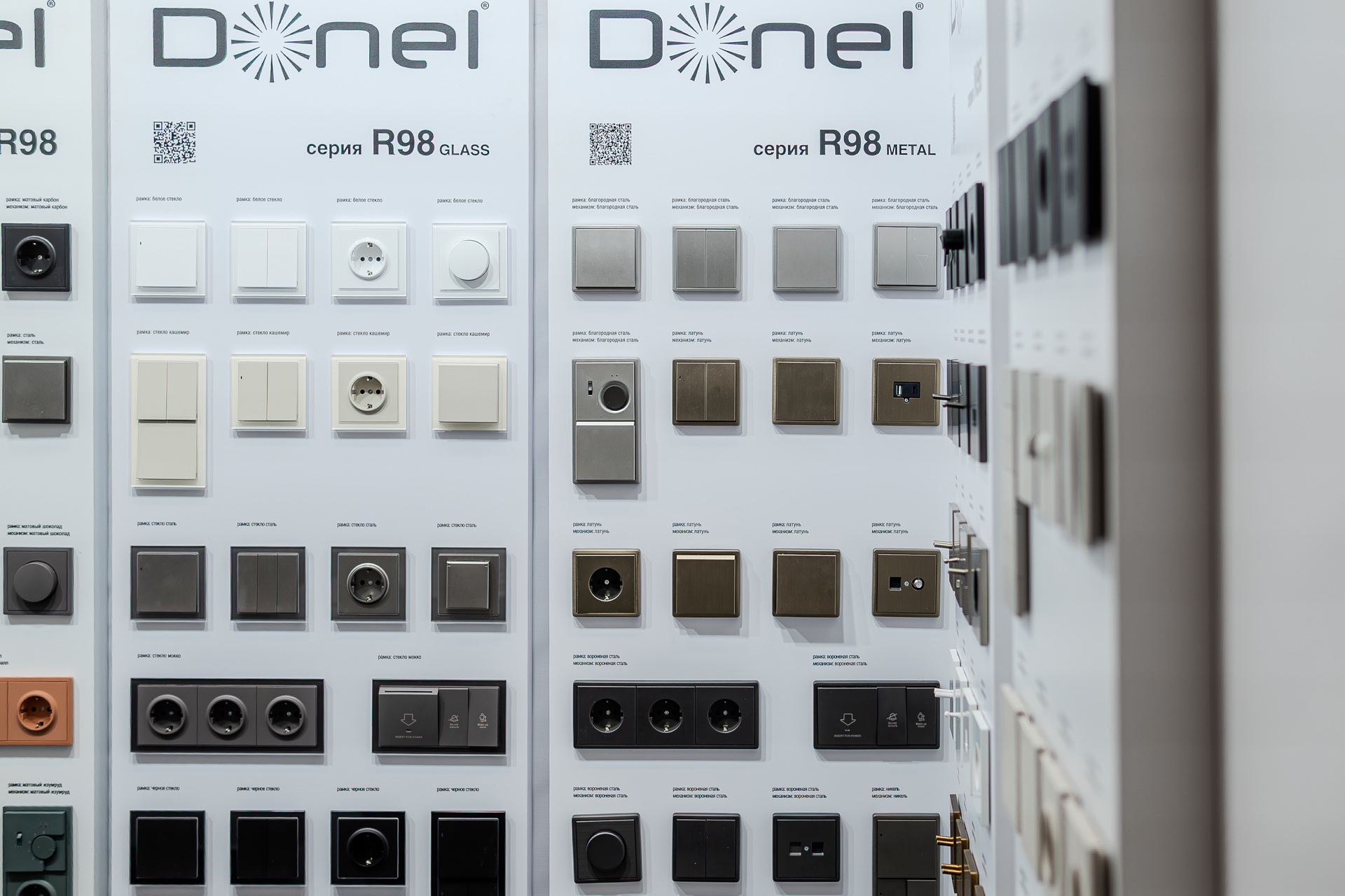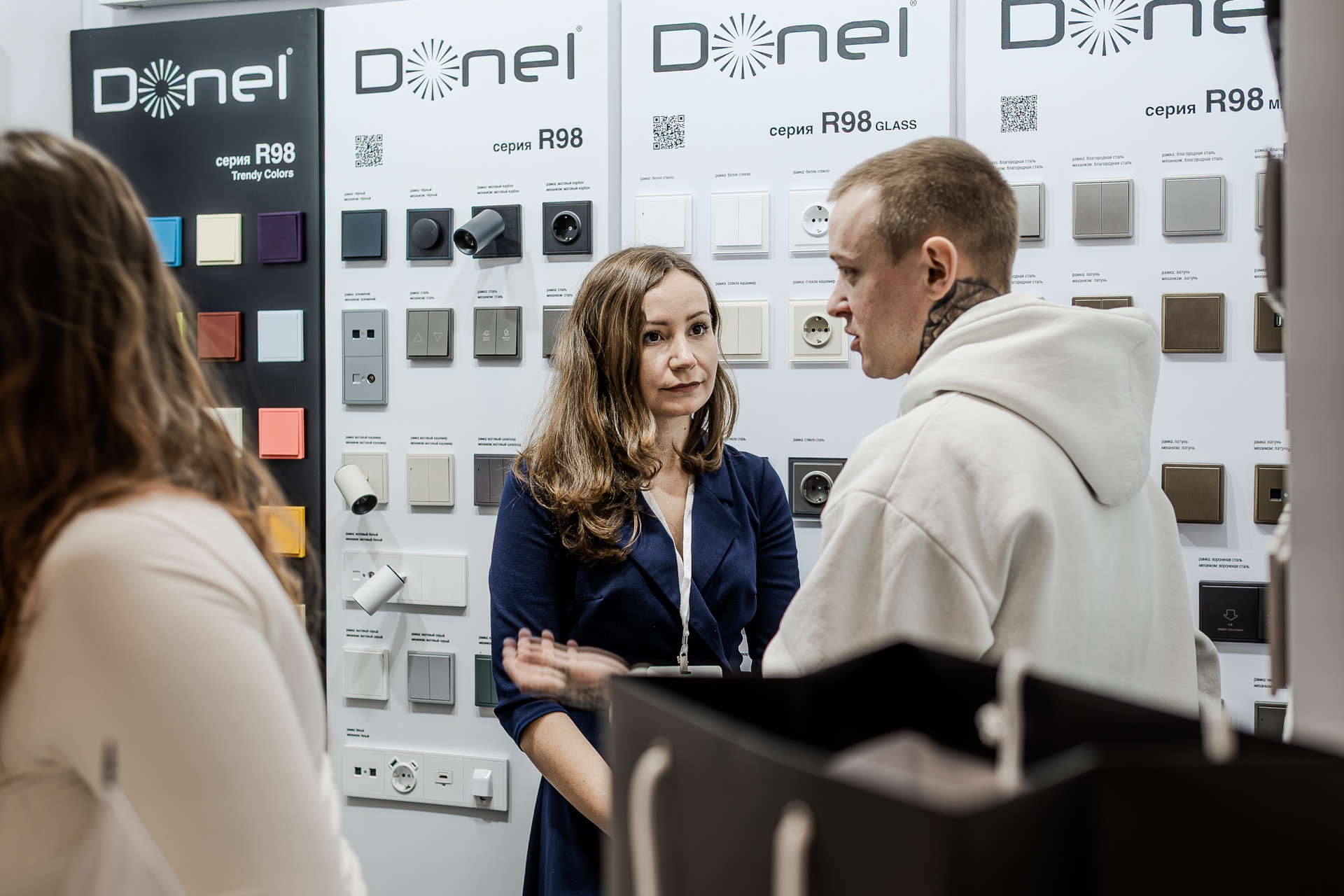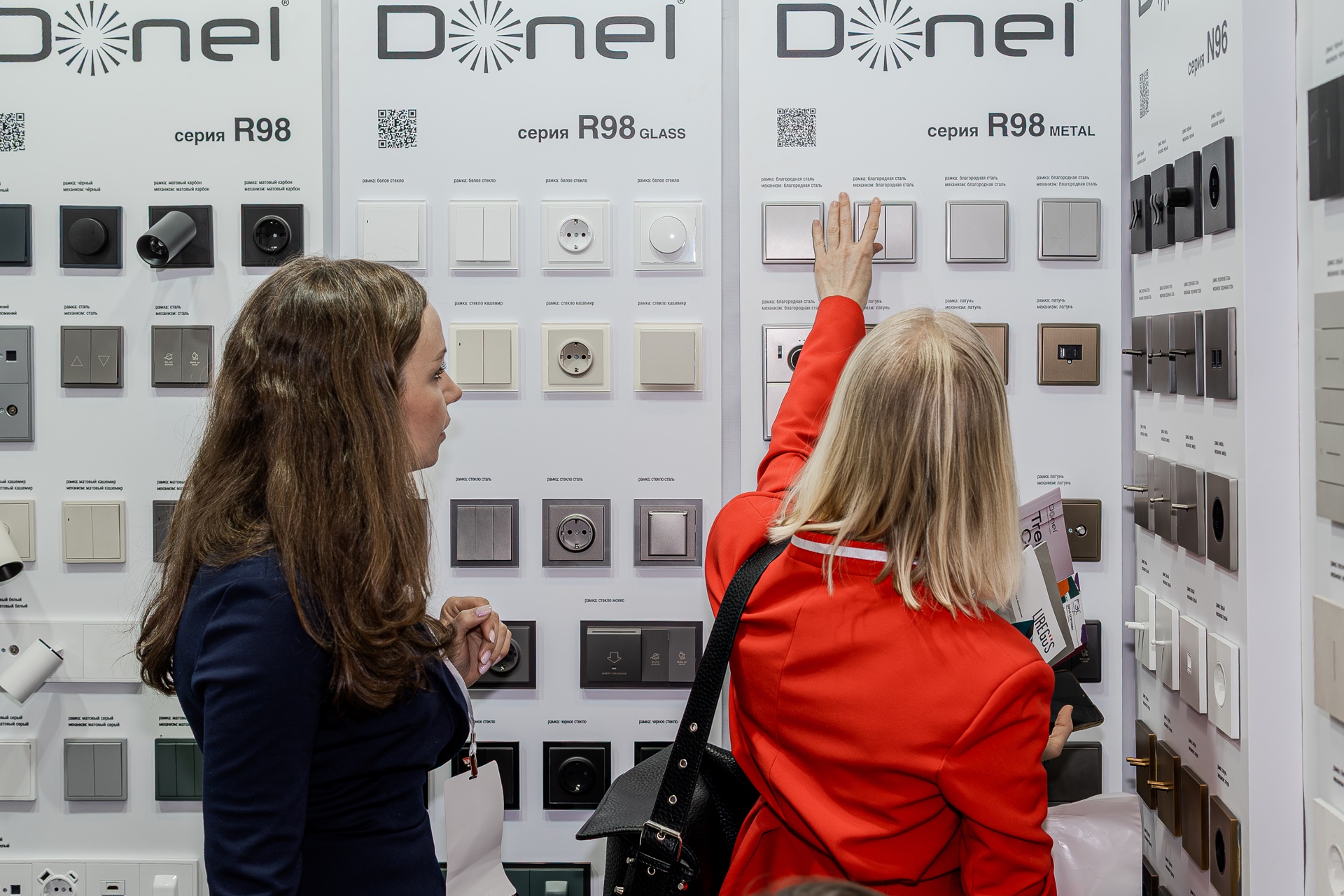 На нашем стенде были представлены актуальные серии электротехнического бренда Donel: полюбившаяся дизайнерам серия R98, включая новинку — тумблерные выключатели R98 Metal, свежие цветовые решения и усовершенствованные механизмы для серий А07 и S08, серия N96 в ретро-стиле, 24 актуальных оттенка линейки Trendy Colors, а также электроустановочные изделия VGD.