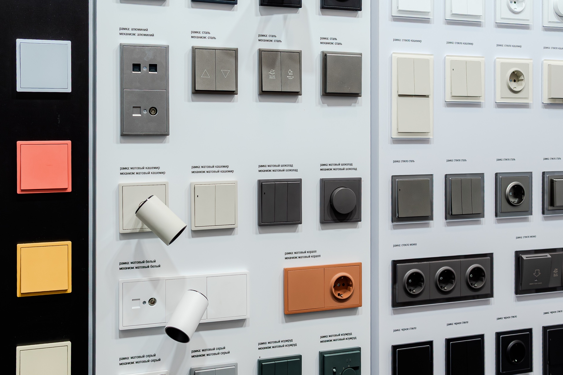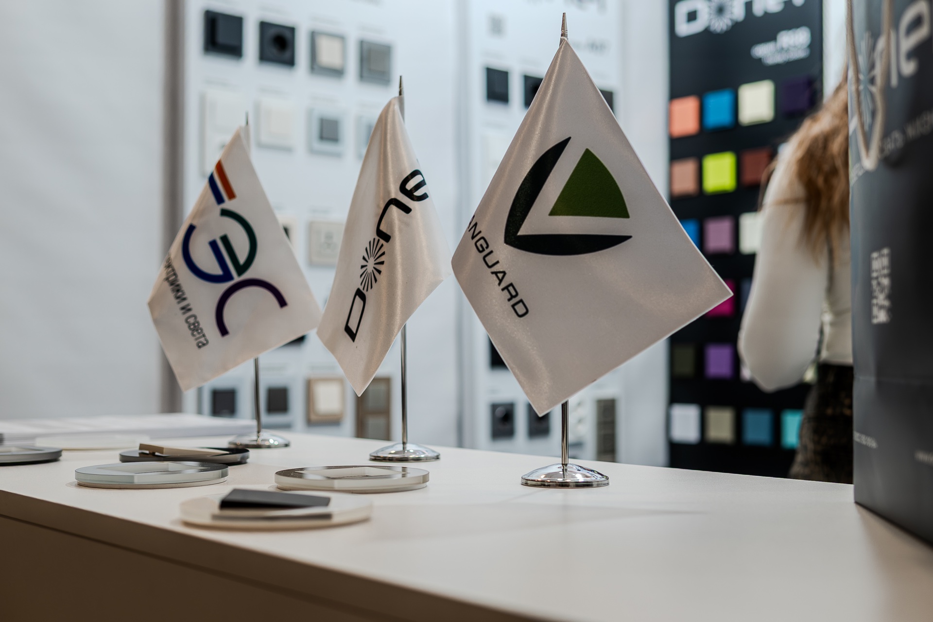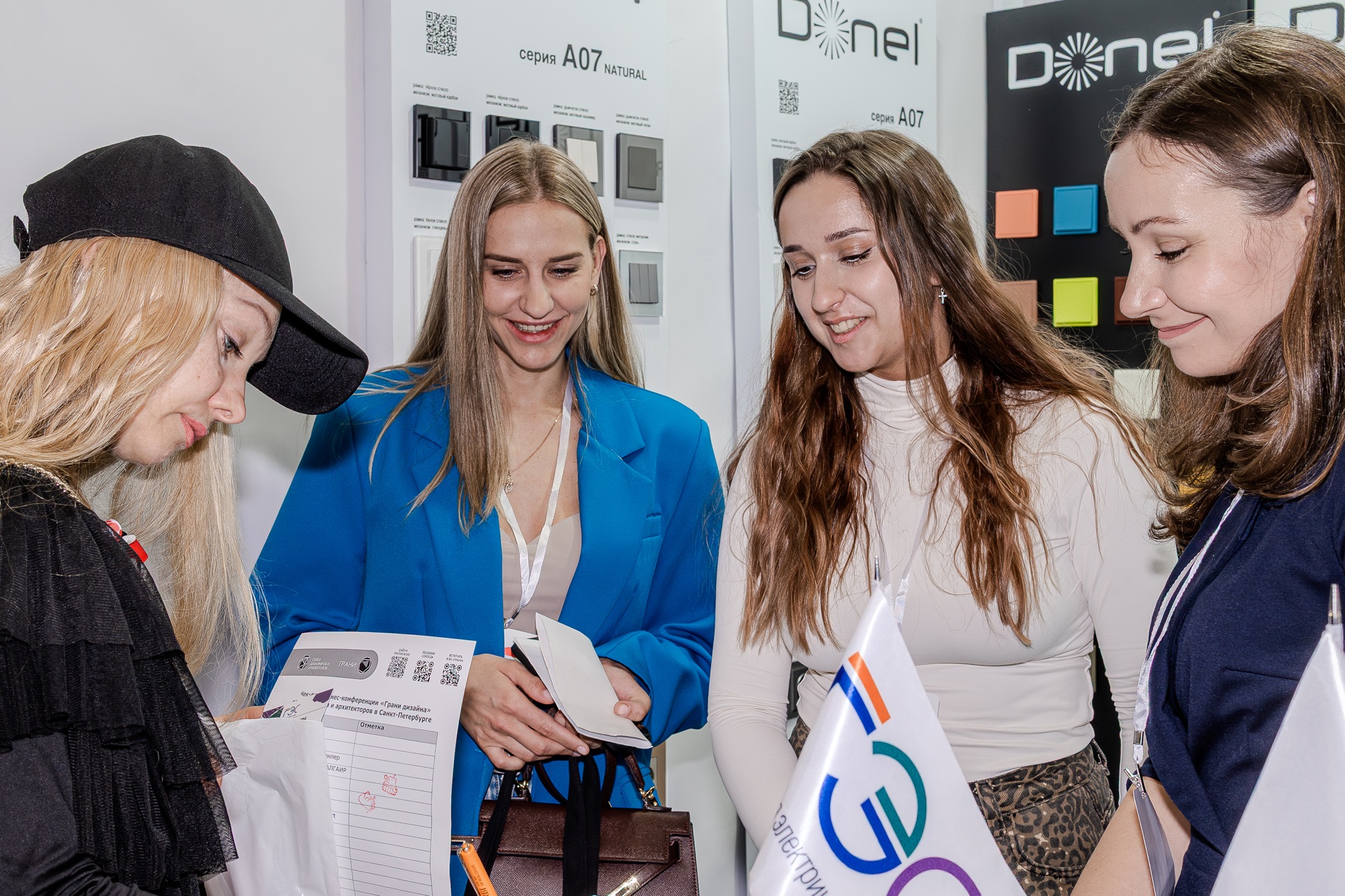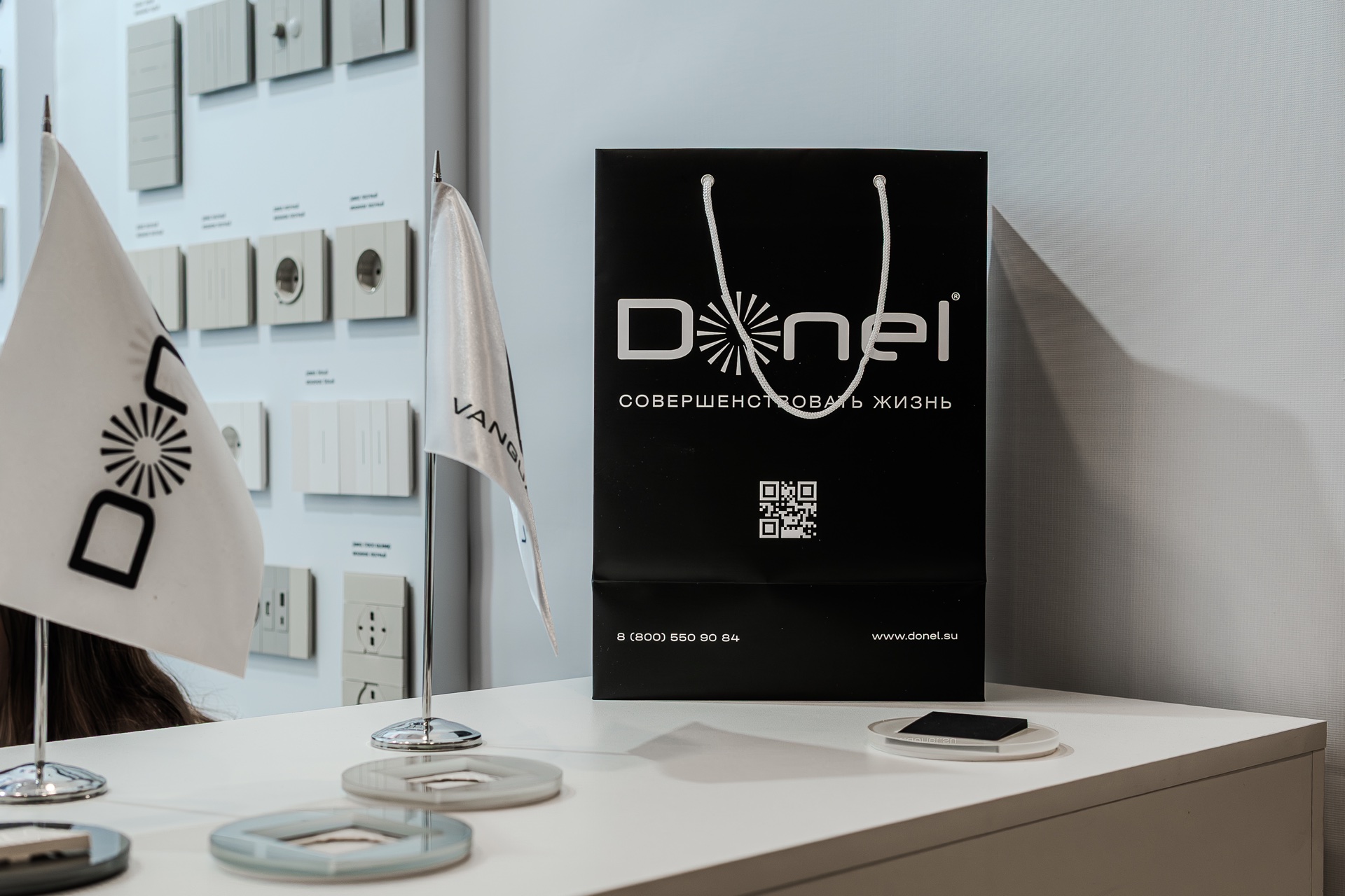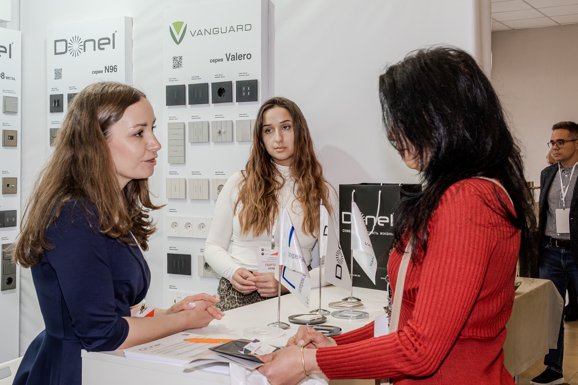 На нашем стенде были представлены актуальные серии электротехнического бренда Donel: полюбившаяся дизайнерам серия R98, включая новинку — тумблерные выключатели R98 Metal, свежие цветовые решения и усовершенствованные механизмы для серий А07 и S08, серия N96 в ретро-стиле, 24 актуальных оттенка линейки Trendy Colors, а также электроустановочные изделия VGD.
