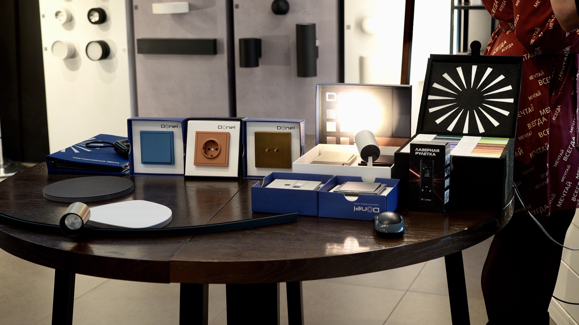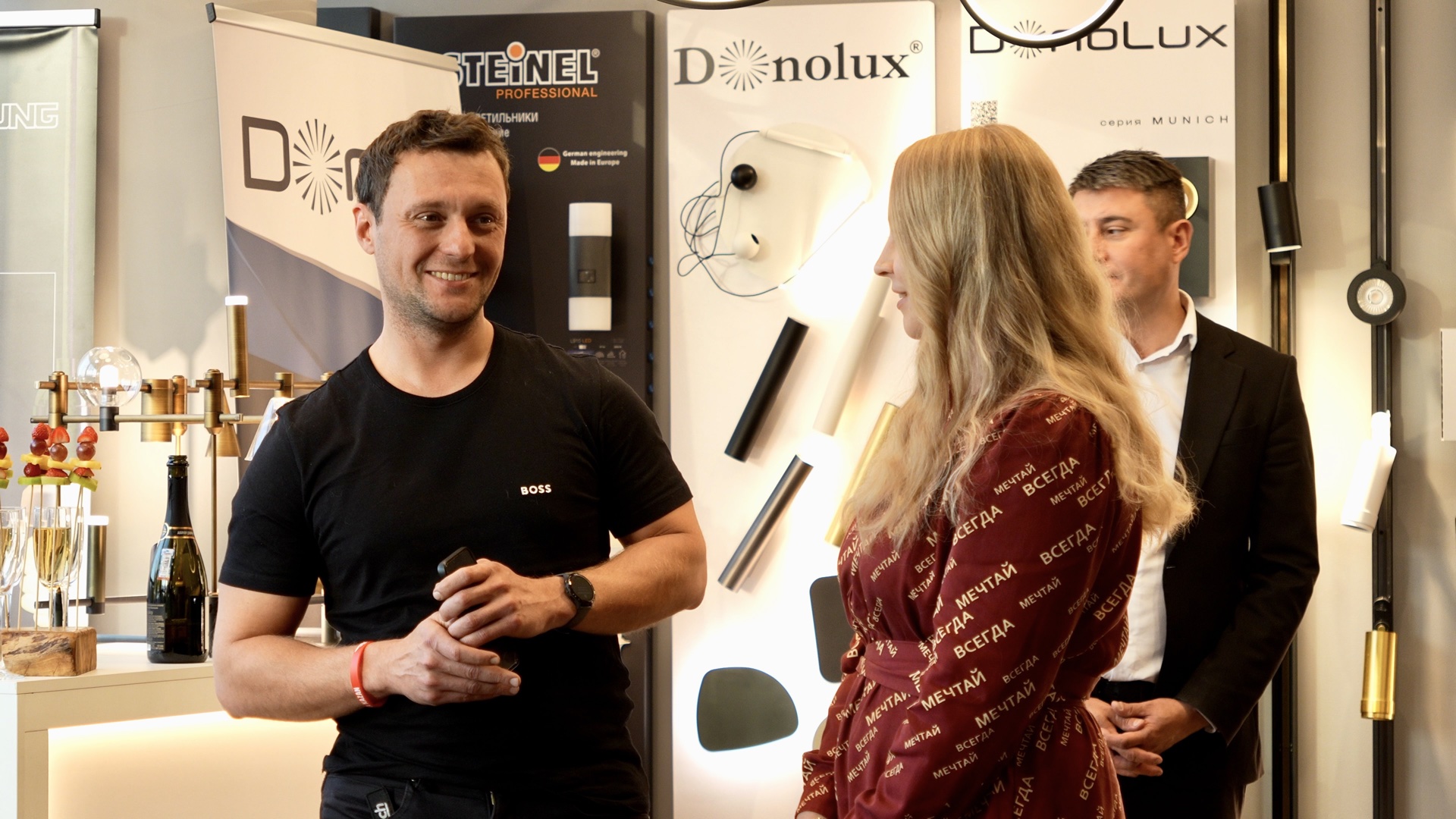 Гости смогли первыми оценить обновленную палитру цветов и материалов в серии электроустановочных изделий R98 от Donel, новые серии A07 и S08, а также стильную коллекцию розеток и тумблерных выключателей N96. Со стороны Donolux внимание привлекли ультратонкая светодиодная система SLIM LINE MINI, накладные светильники MUNICH и другие новинки.