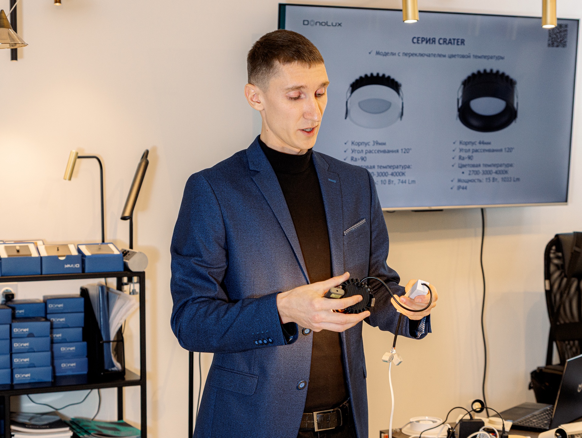 Тренинг-менеджер по продукту представил самые востребованные новинки от брендов Donel и Donolux - пополнение линейки цветов и материалов (металл и стекло) серии электротехники R98 от Donel, новые серии электроустановочных изделий A07 и S08, стильную серию розеток и тумблерных выключателей N96, а также хит продаж от бренда Donolux - ультратонкую светодиодную систему освещения SLIM LINE MINI.