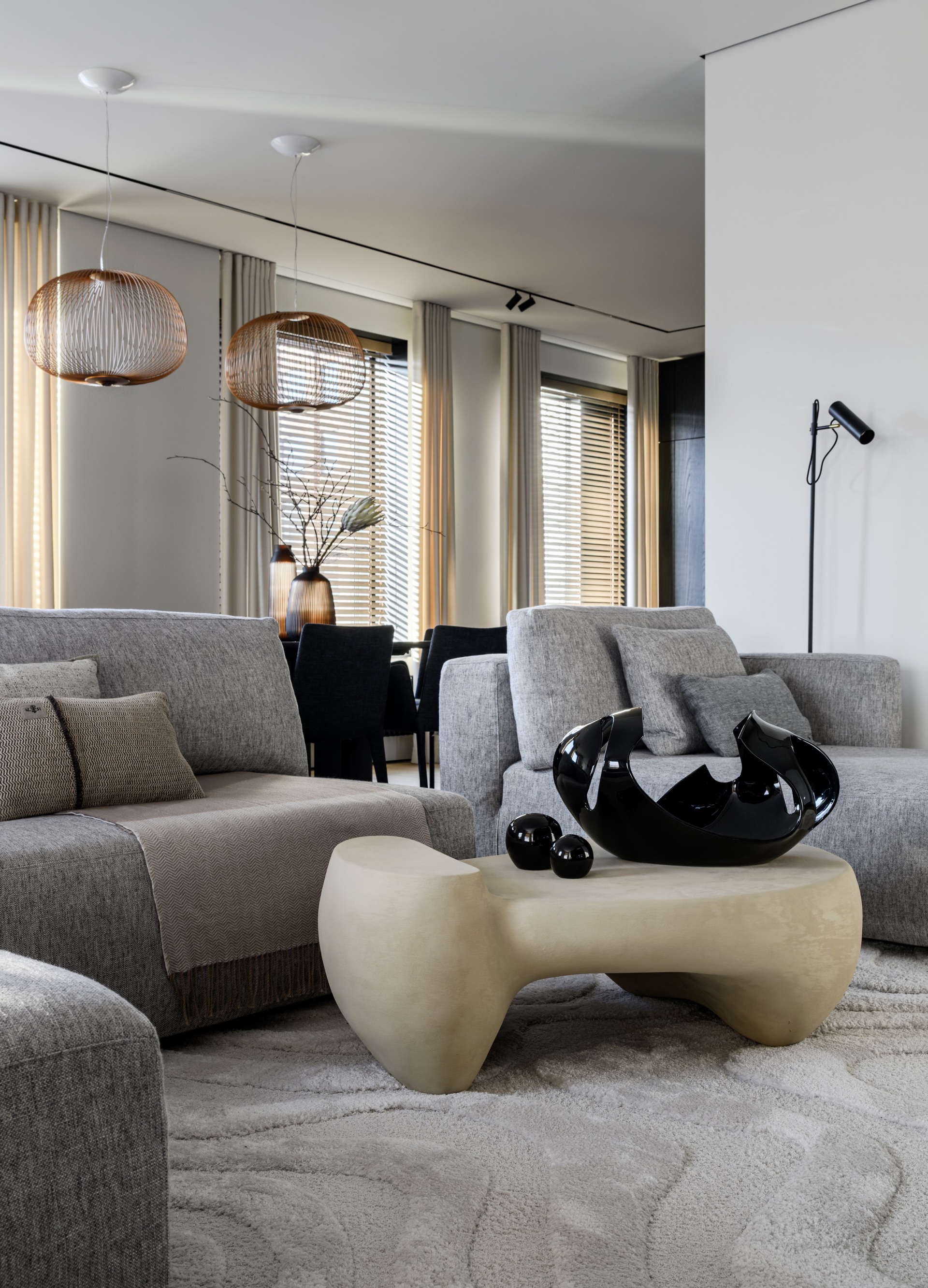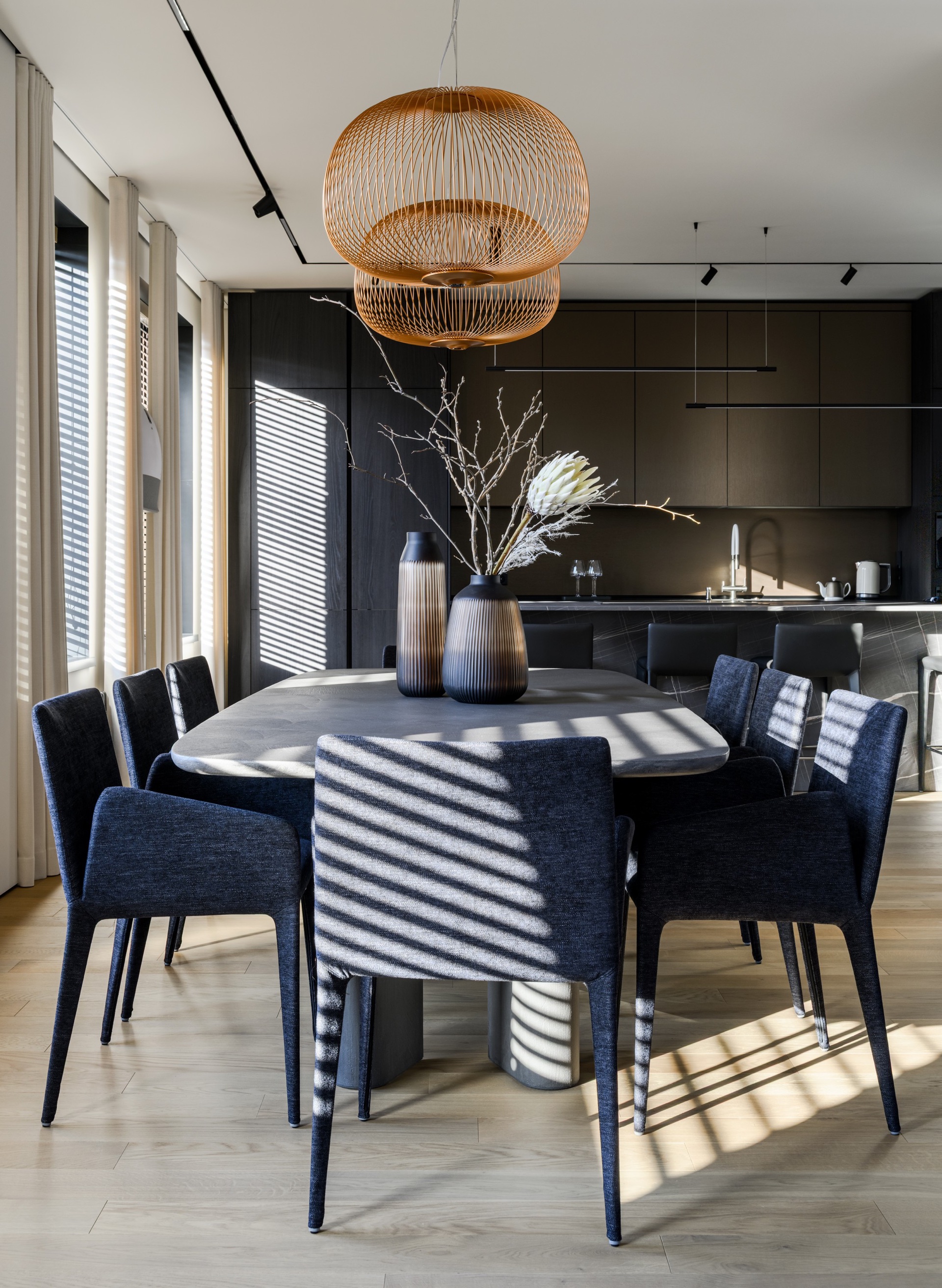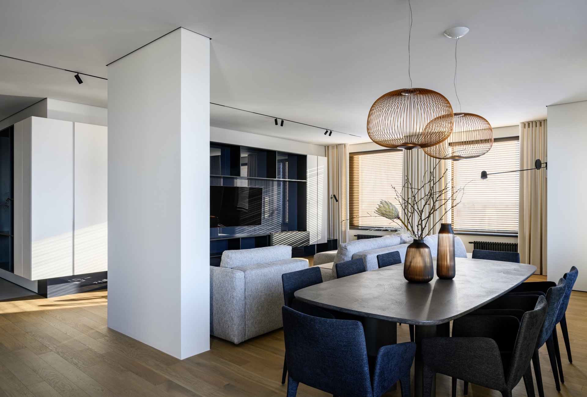 Сегодня в центре внимания проект архитекторов Юлии Новосадовой и Александры Заморевой – современная и комфортная квартира, в которой учтены потребности всех членов большой семьи. Квартира органично делится на общественную часть с зонами прихожей, кухни, столовой, гостиной, и приватную, где находятся мастер-блок и детские спальни.