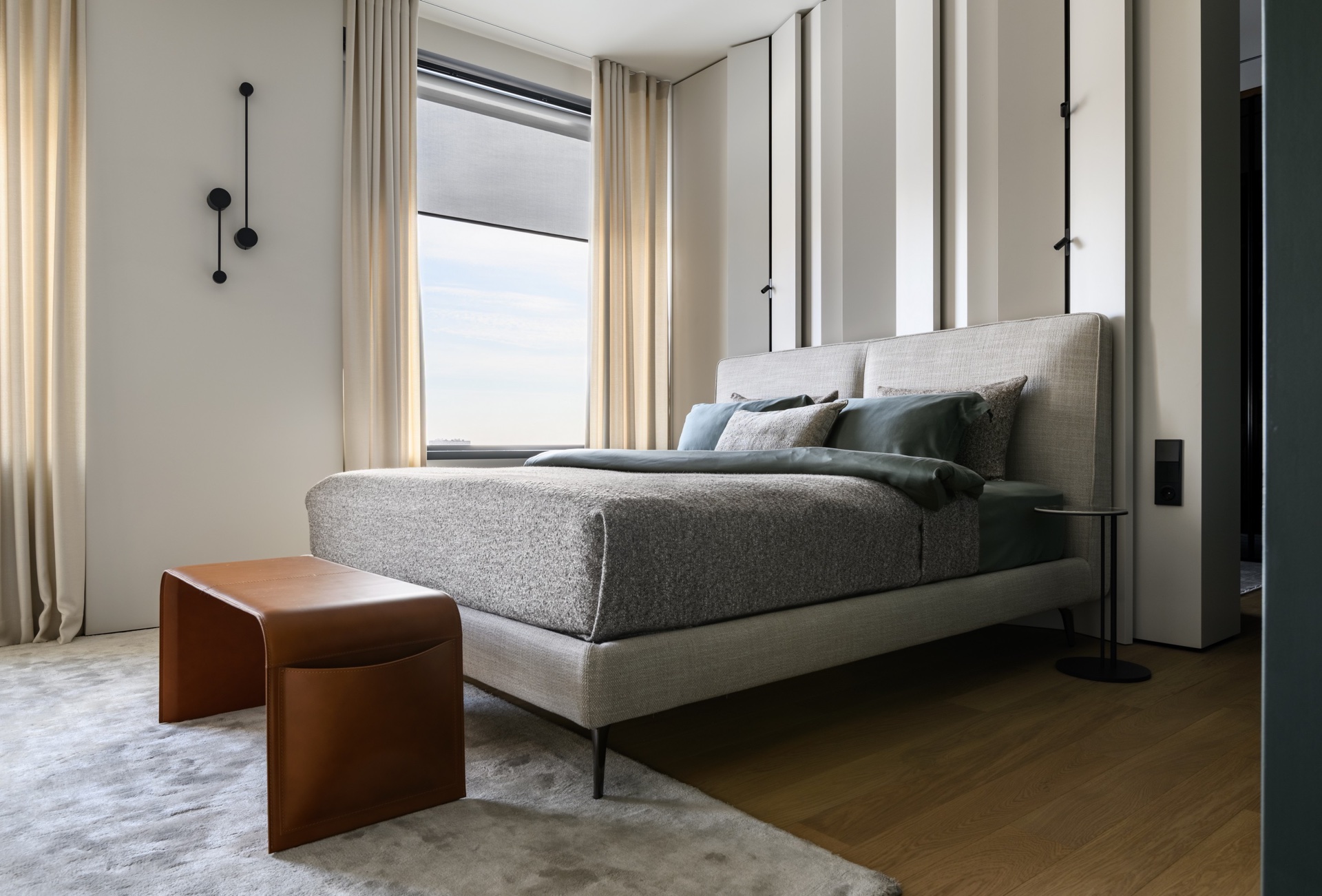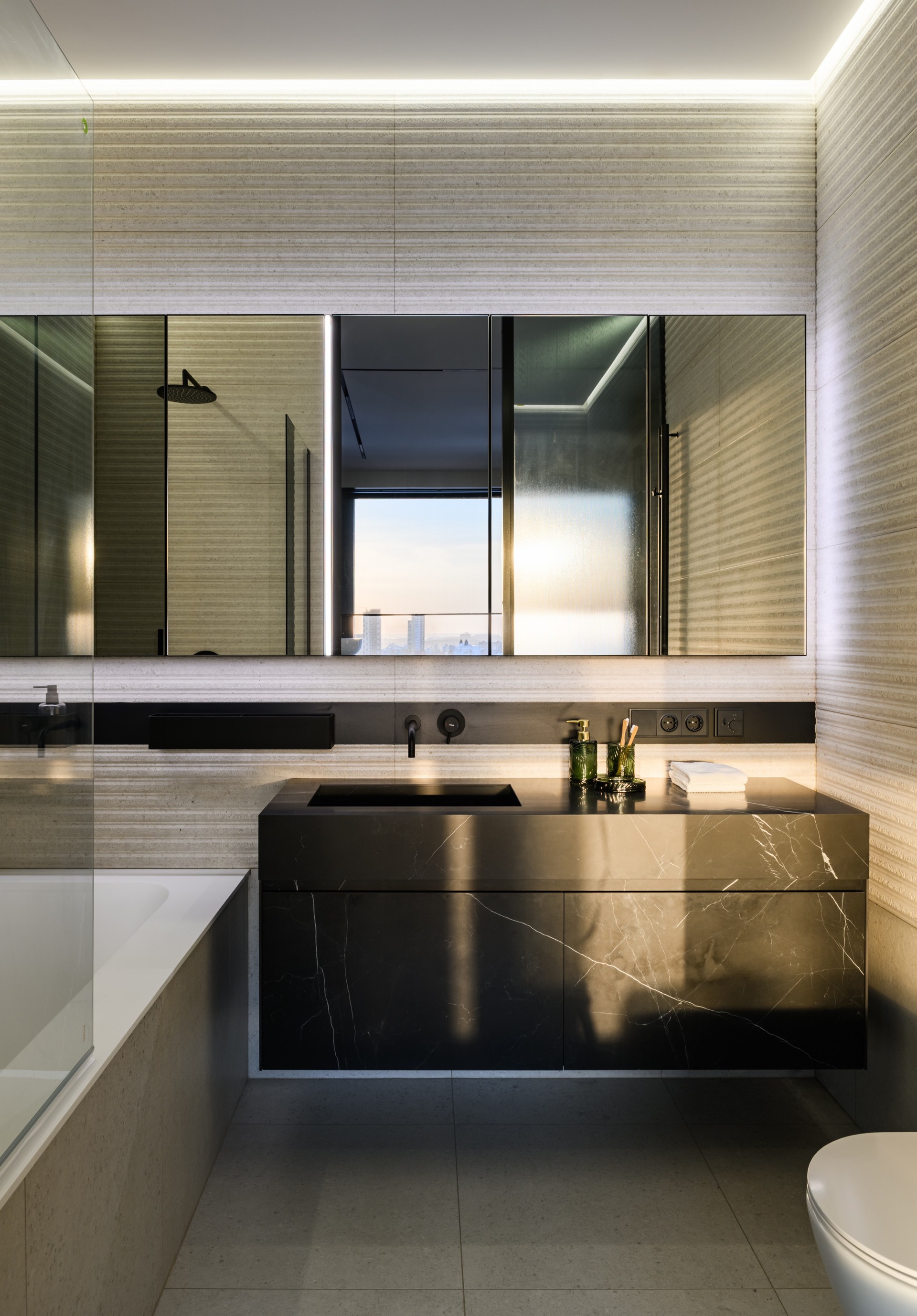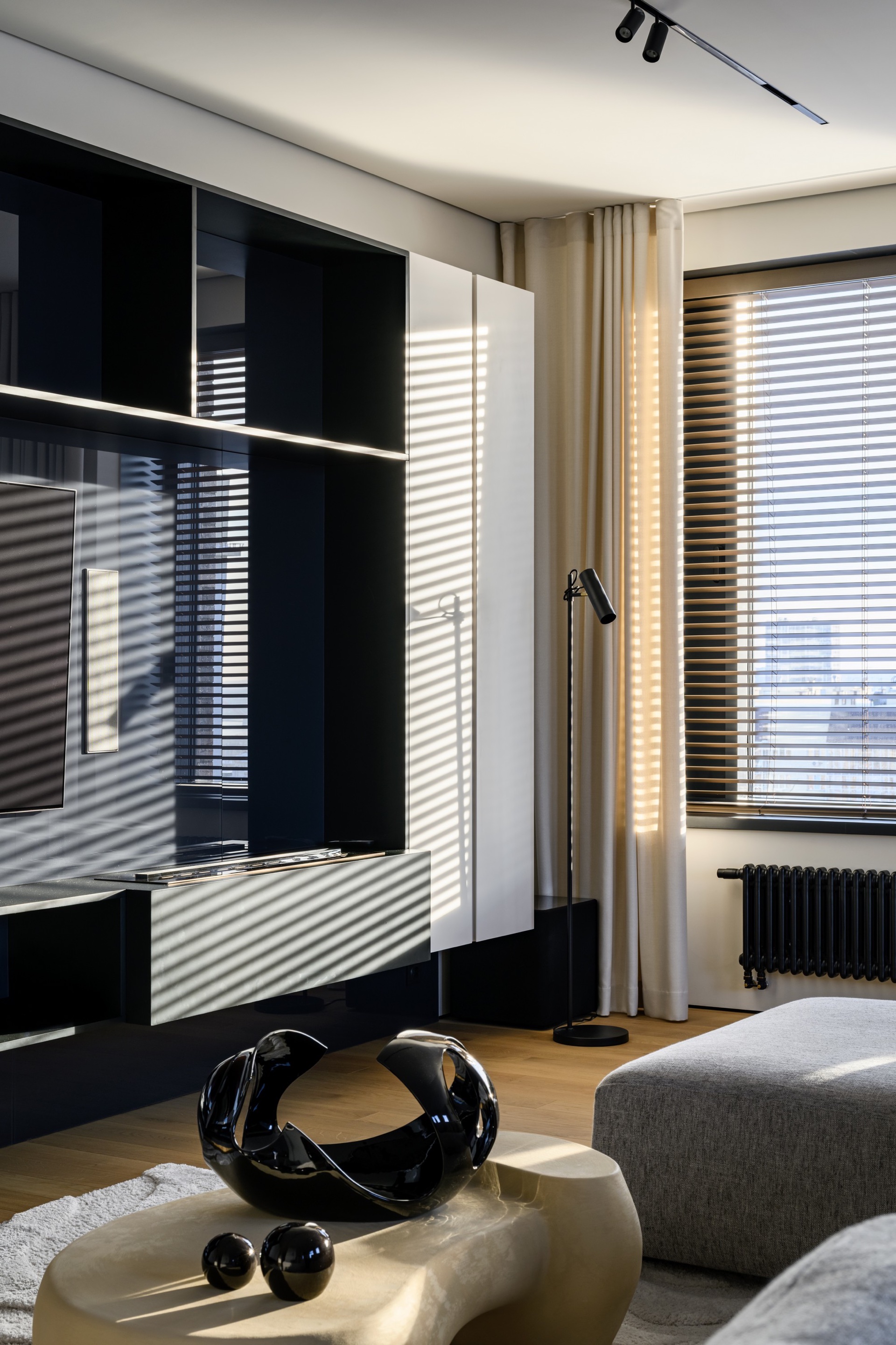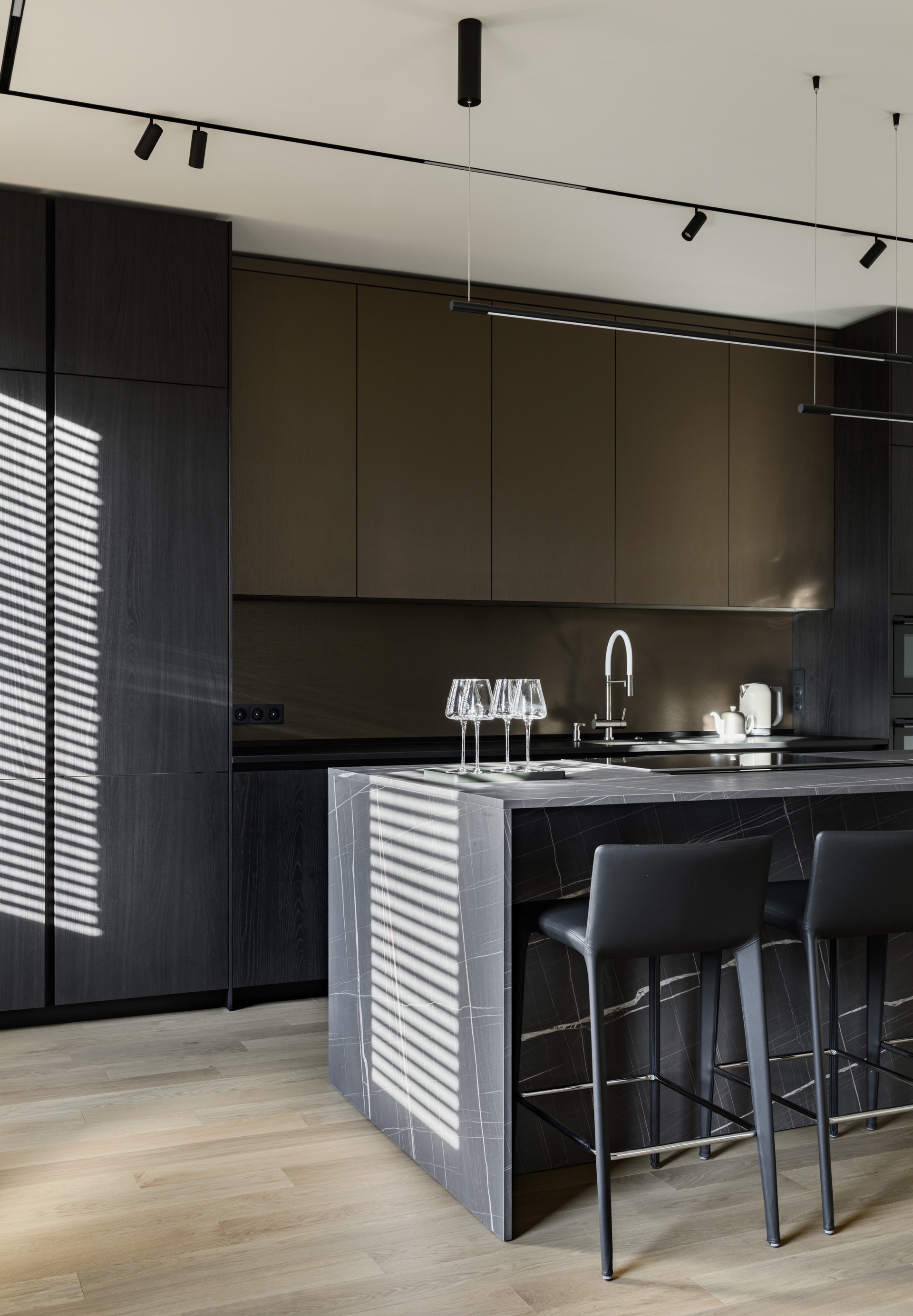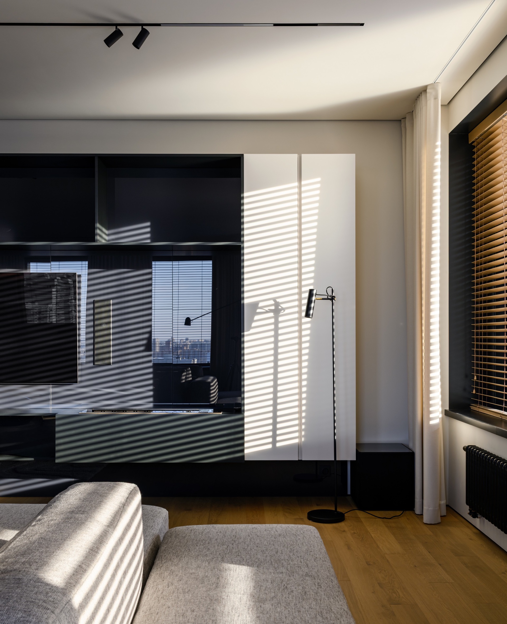 Идеальным дополнением интерьера стало освещение Donolux. Для основного освещения использовали трековое освещение SPACE-TRACK SYSTEM. Это одна из самых популярных трековых систем освещения бренда Donolux. Она идеально решает любую задачу светового дизайна. Система компактна, ширина внутренней части трека составляет всего 26 мм, поэтому после установки вы увидите только узкую ровную линию, вместо медных контактов. Кроме того, возможно подключение системы к Умному дому для управления через приложение или при помощи голосового помощника. На треке установили светильники серии ALPHA. Это лаконичные светильники с узкой оптикой 36° и высоким индексом цветопередачи. Дополнительно на треках разместили светильники серии LINE. Они целиком утапливаются в корпус магнитной шины. Так как источник света закрыт белым рассеивателем из поликарбоната, получается комфортный для глаз рассеянный свет.
