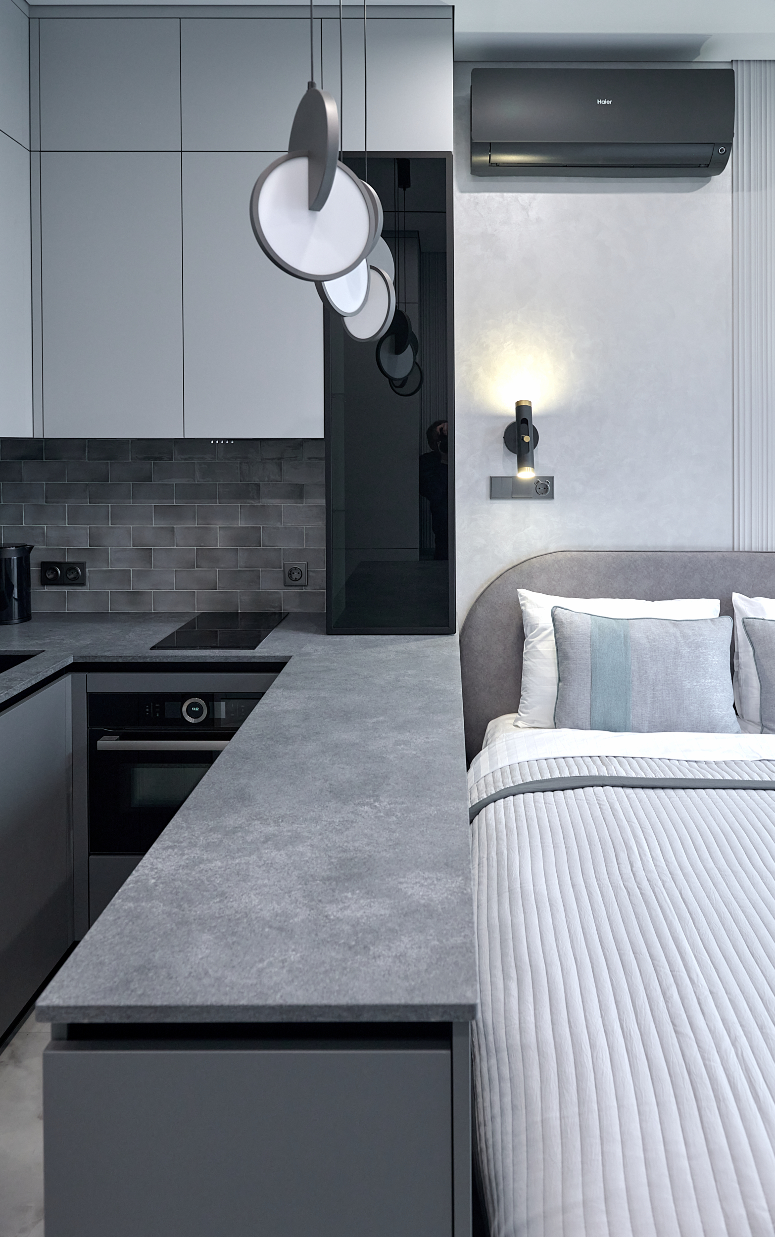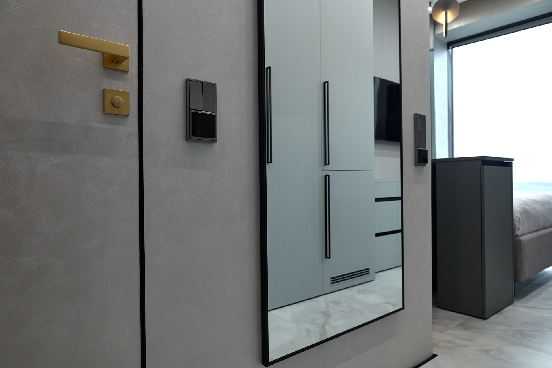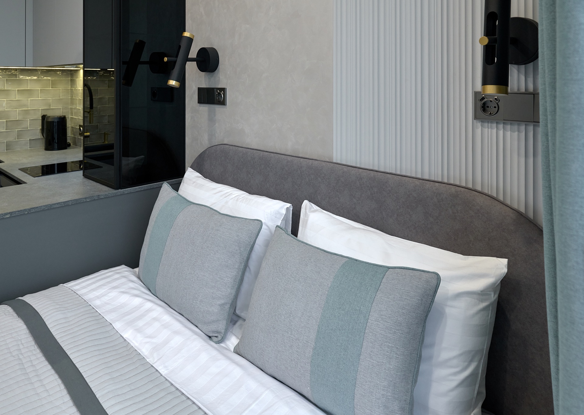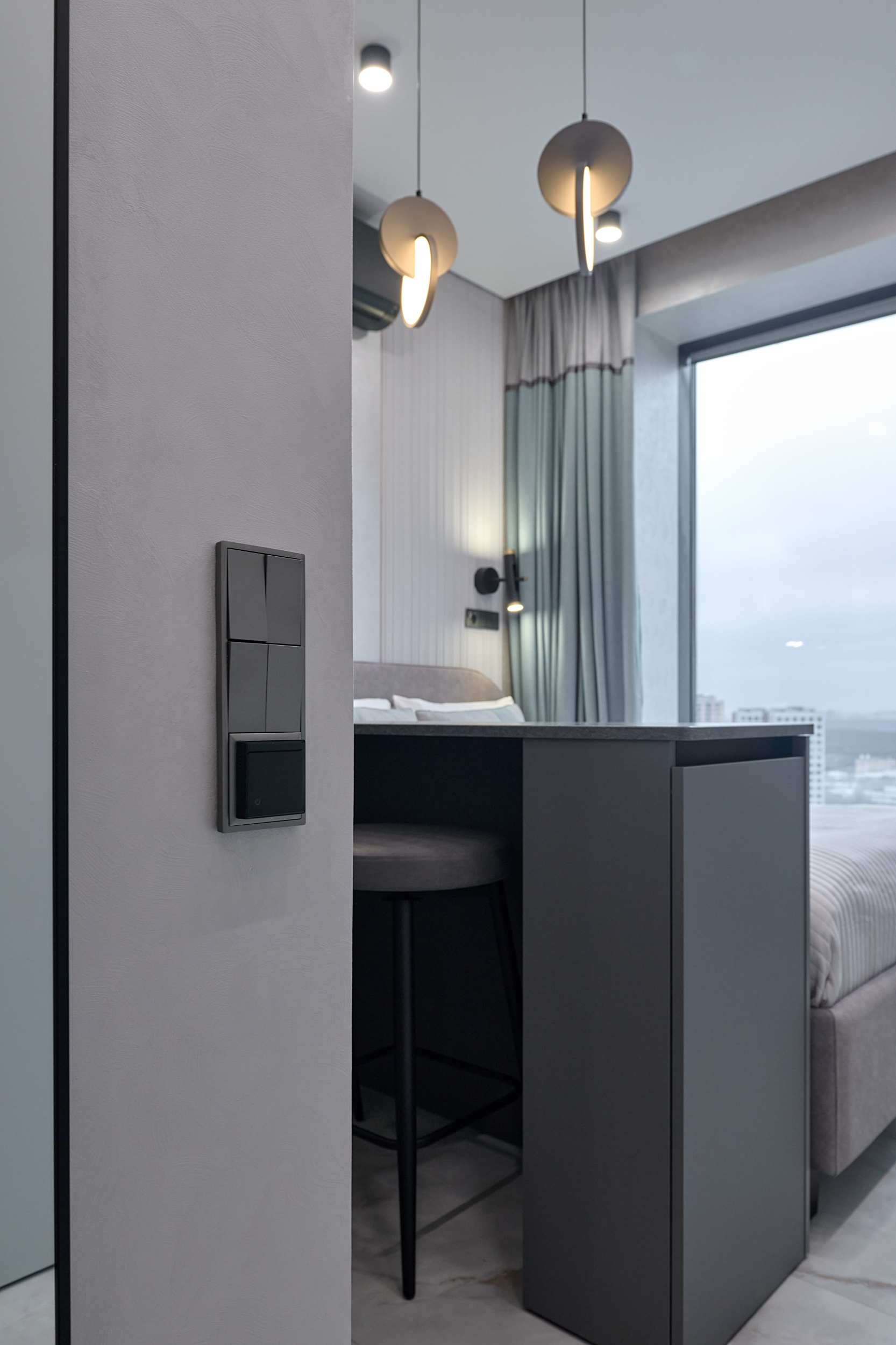 В проекте представлены розетки и выключатели Donel R98. Реализованный проект студии площадью 19,5 м², расположенной в ЖК Level Причальный. Основная палитра - оттенки серого, создающие ощущение спокойствия и простора. Акценты выполнены в бирюзовых тонах: они привносят свежесть и динамичность, гармонируя с живописным видом на воду из панорамного окна. Отличным дополнением интерьера стали розетки и выключатели Donel R98.