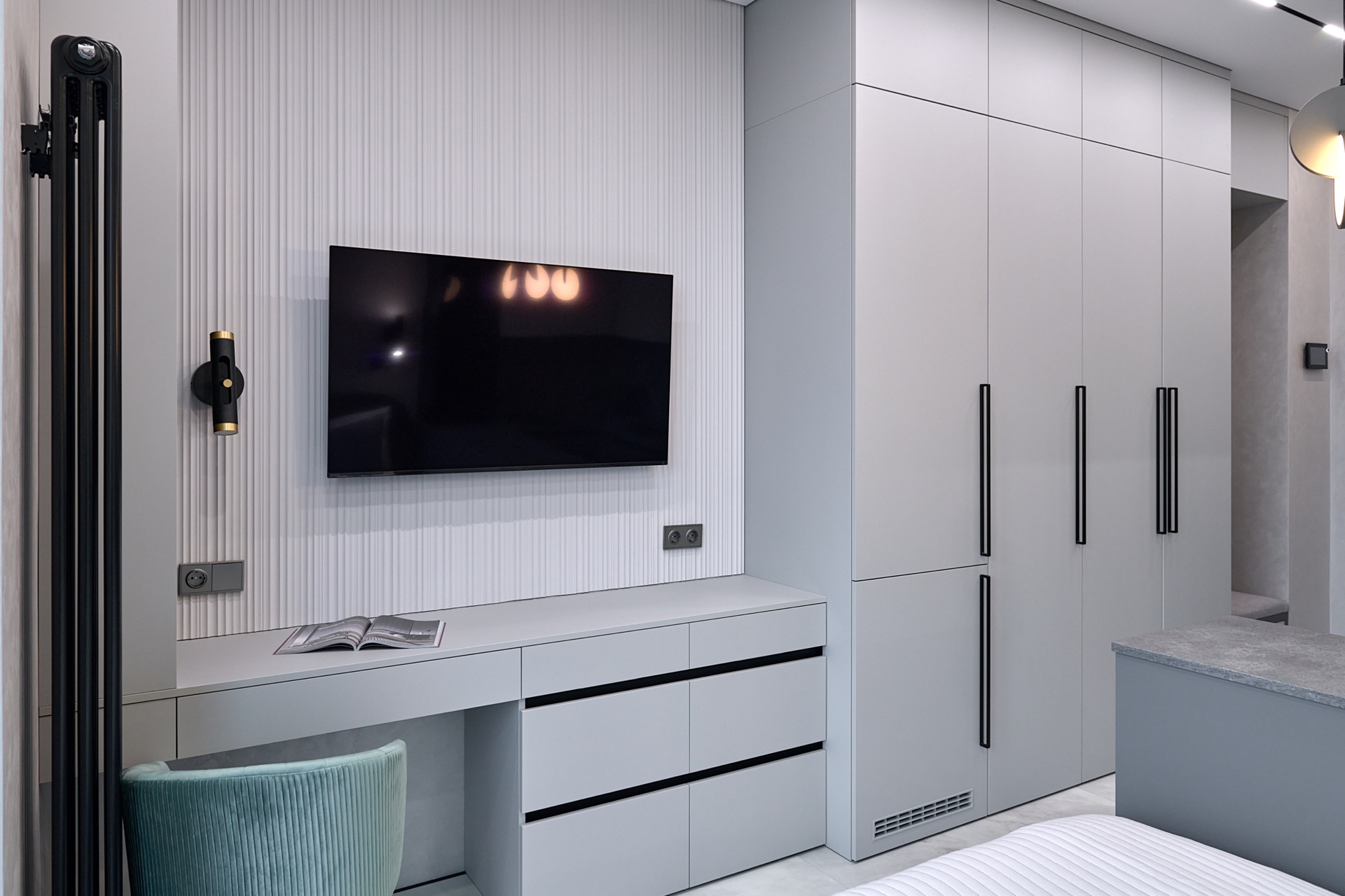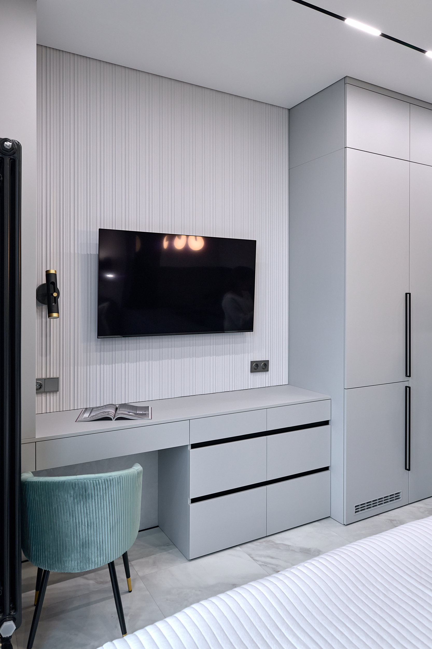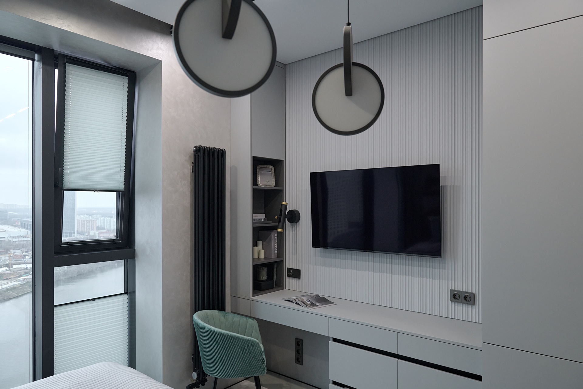 В проекте представлены розетки и выключатели Donel R98. Реализованный проект студии площадью 19,5 м², расположенной в ЖК Level Причальный. Основная палитра - оттенки серого, создающие ощущение спокойствия и простора. Акценты выполнены в бирюзовых тонах: они привносят свежесть и динамичность, гармонируя с живописным видом на воду из панорамного окна. Отличным дополнением интерьера стали розетки и выключатели Donel R98.