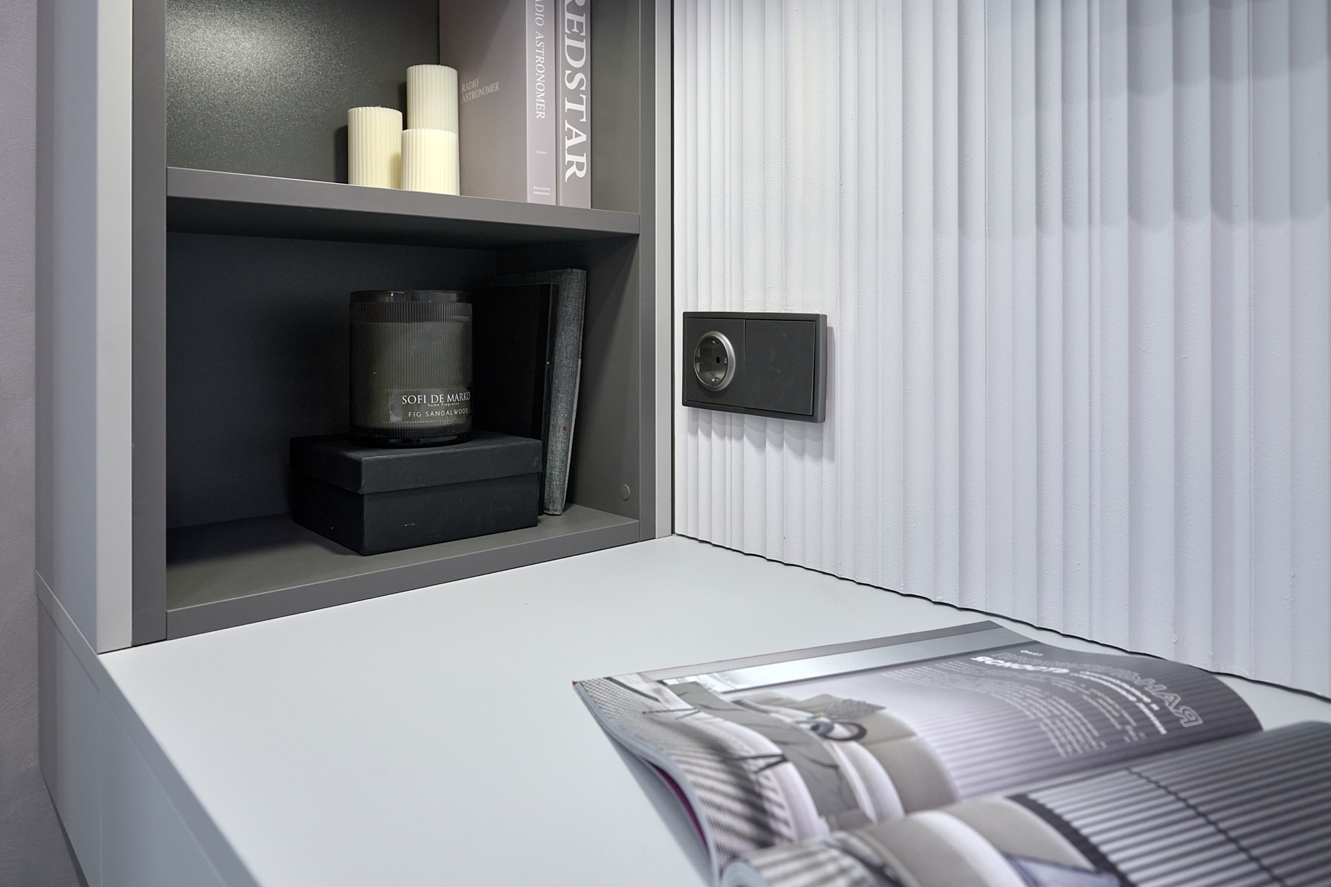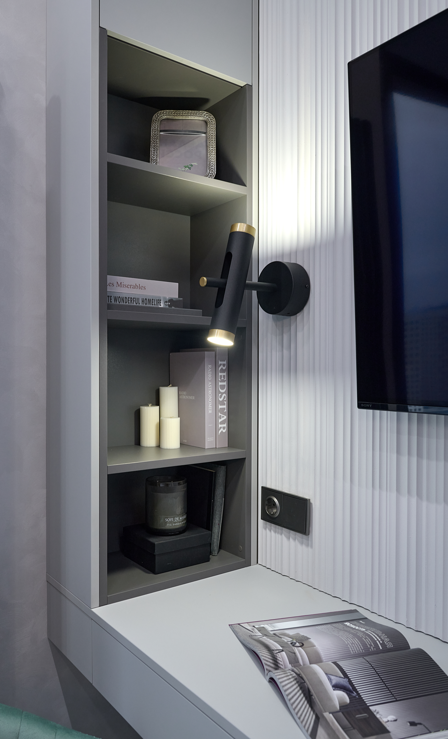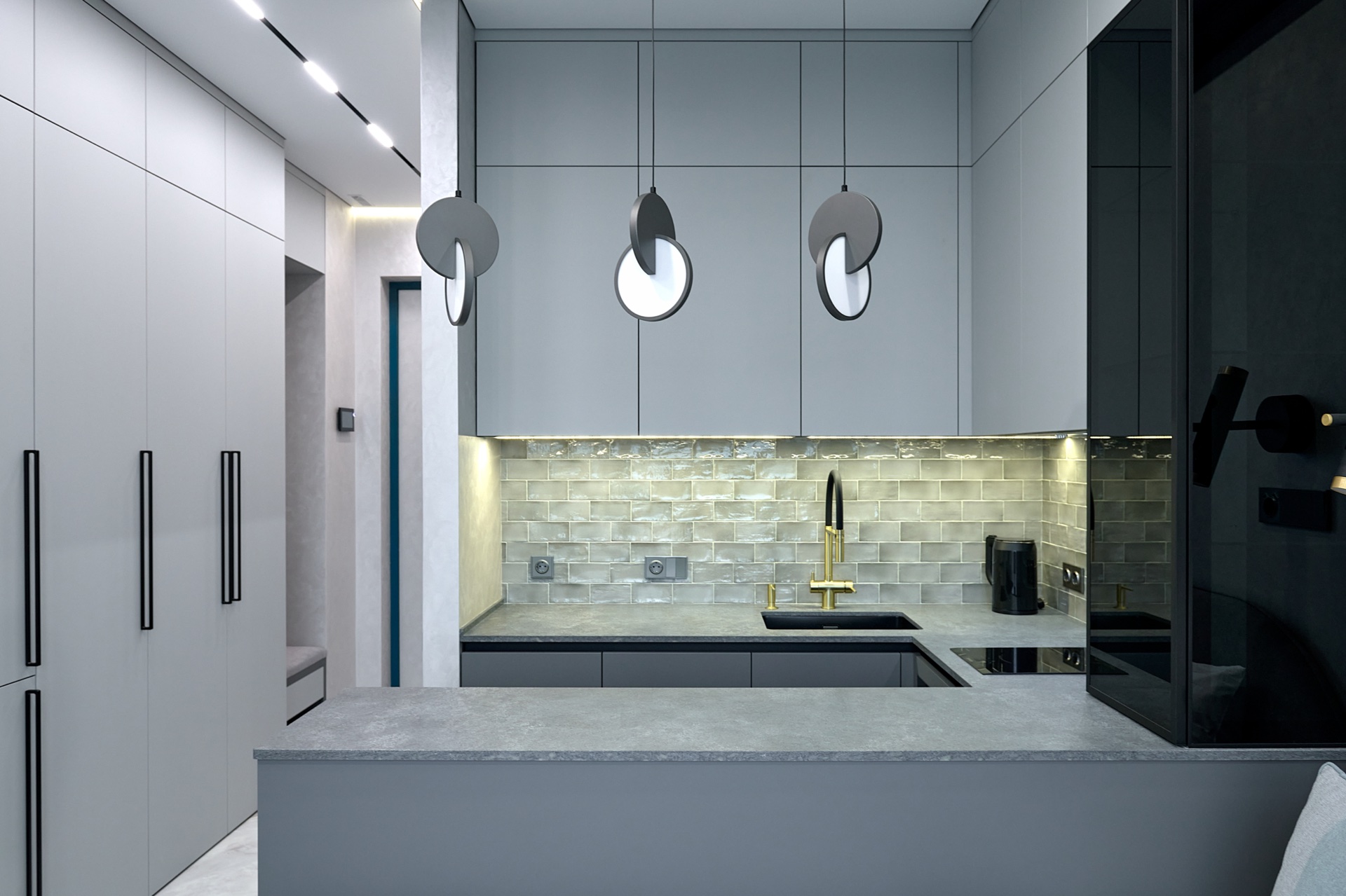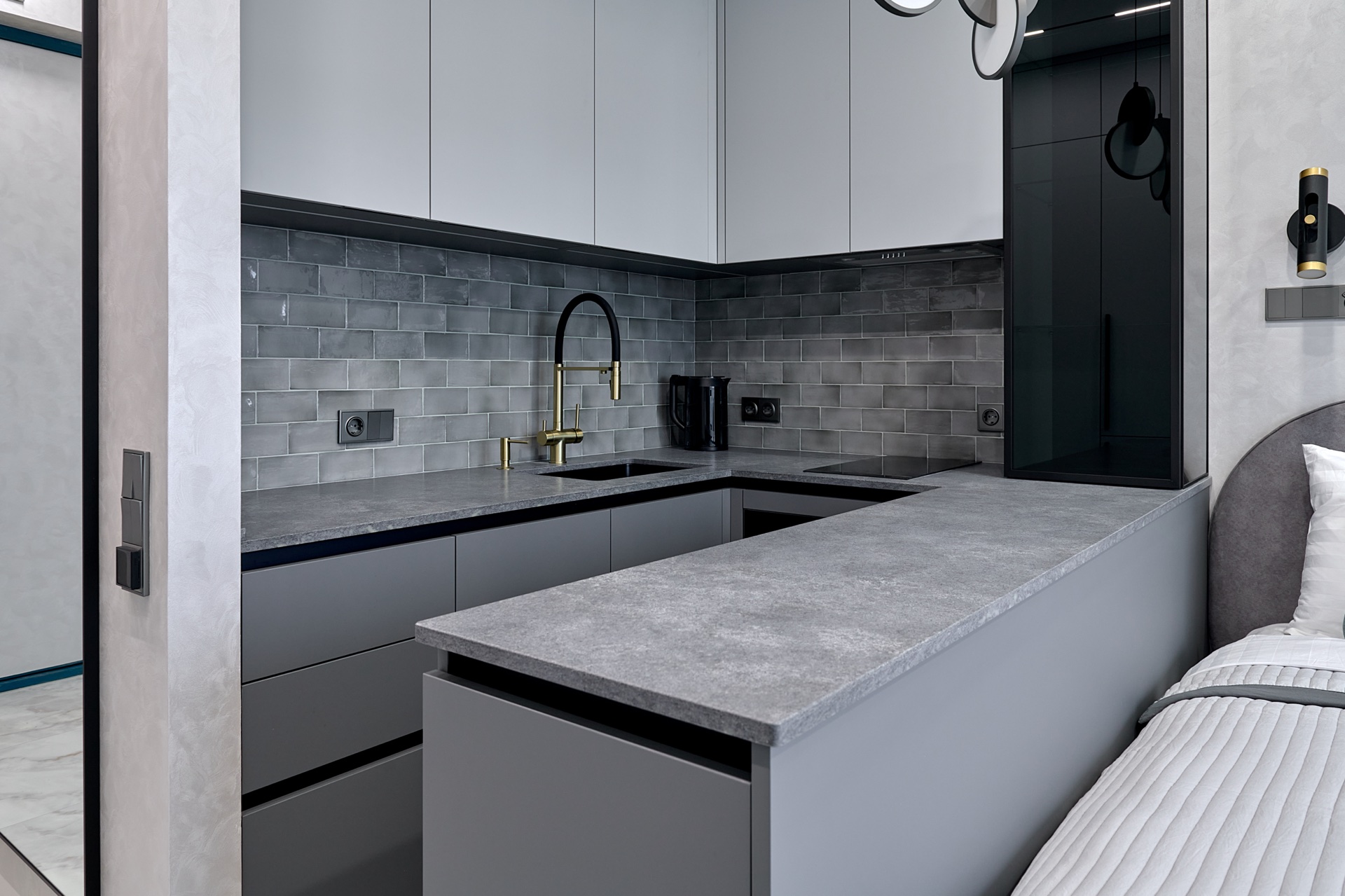 В проекте представлены розетки и выключатели Donel R98. Реализованный проект студии площадью 19,5 м², расположенной в ЖК Level Причальный. Основная палитра - оттенки серого, создающие ощущение спокойствия и простора. Акценты выполнены в бирюзовых тонах: они привносят свежесть и динамичность, гармонируя с живописным видом на воду из панорамного окна. Отличным дополнением интерьера стали розетки и выключатели Donel R98.