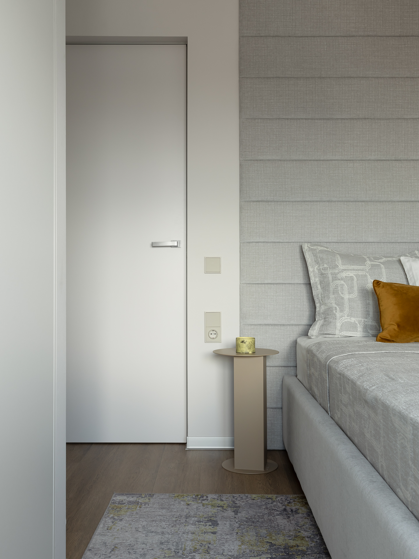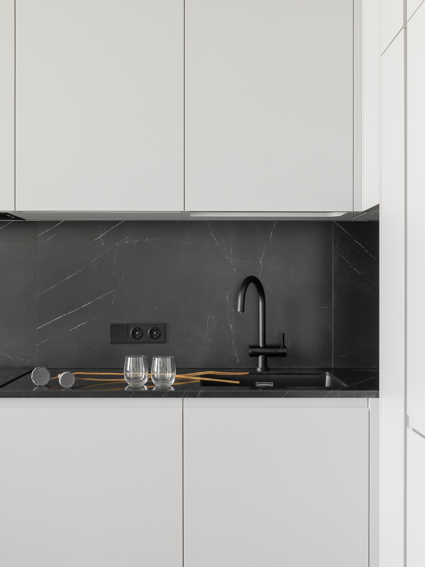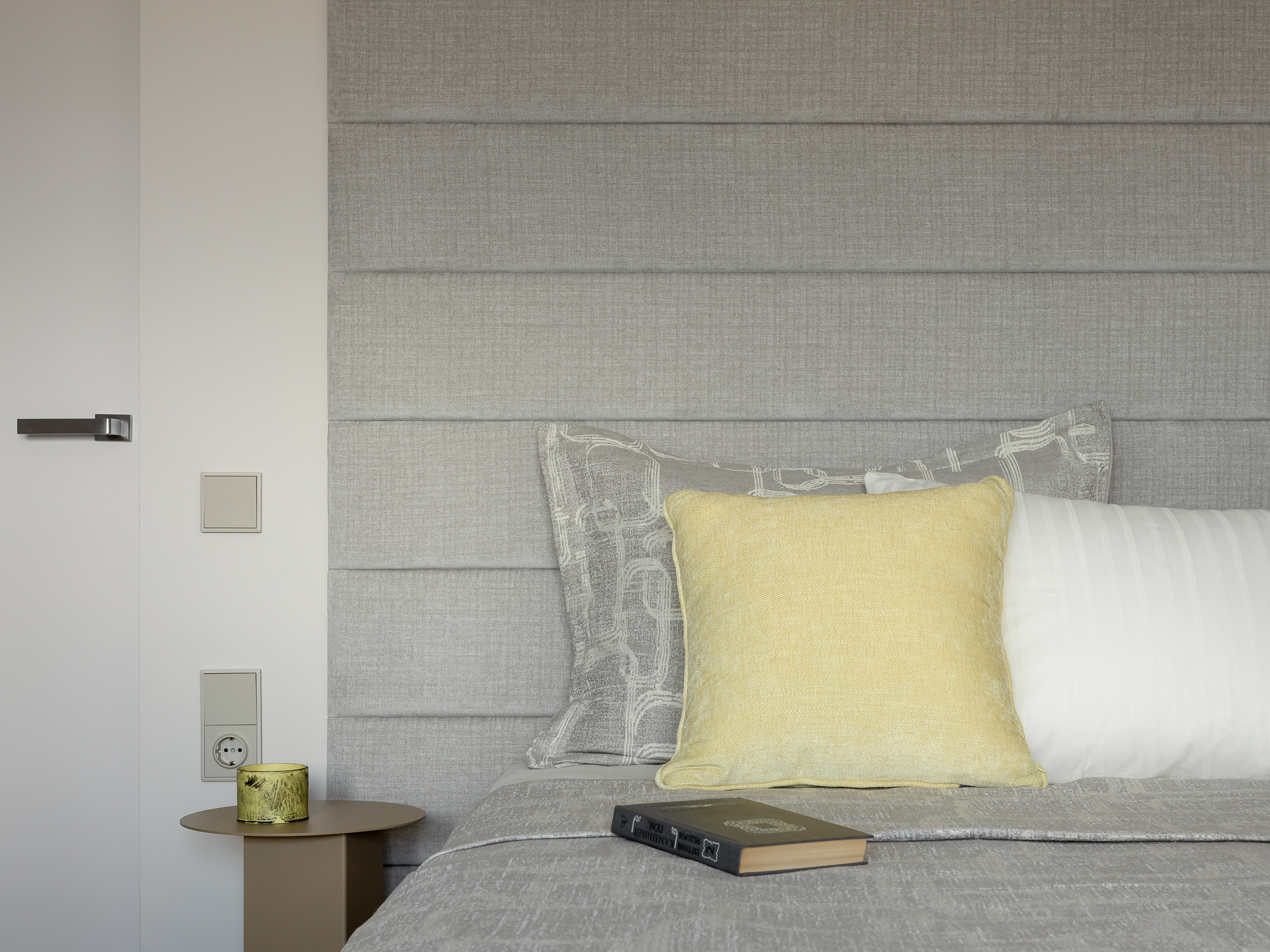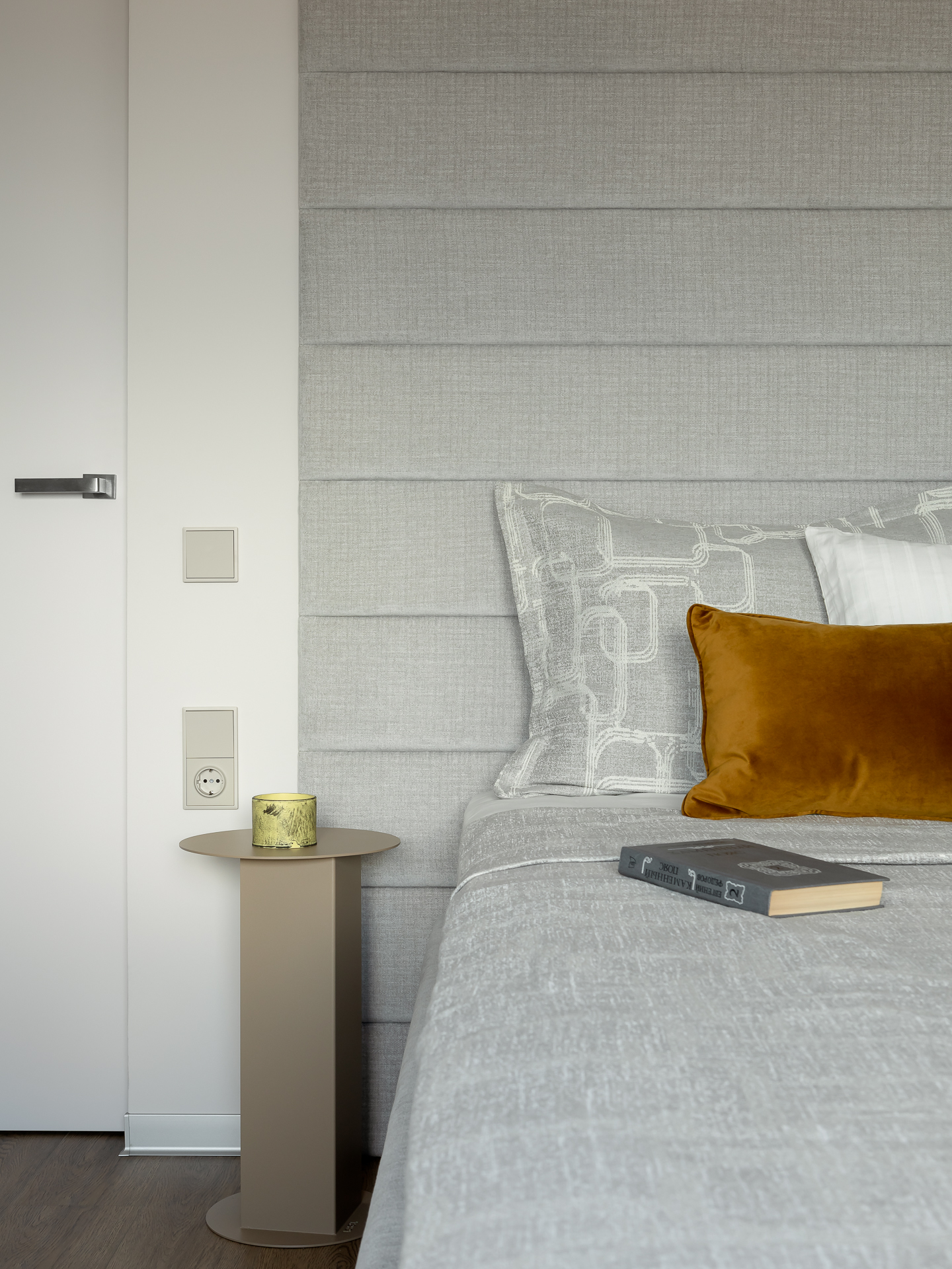 В проекте представлены электроустановочные изделия Donel R98 в цвете матовый карбон и матовый кашемир.