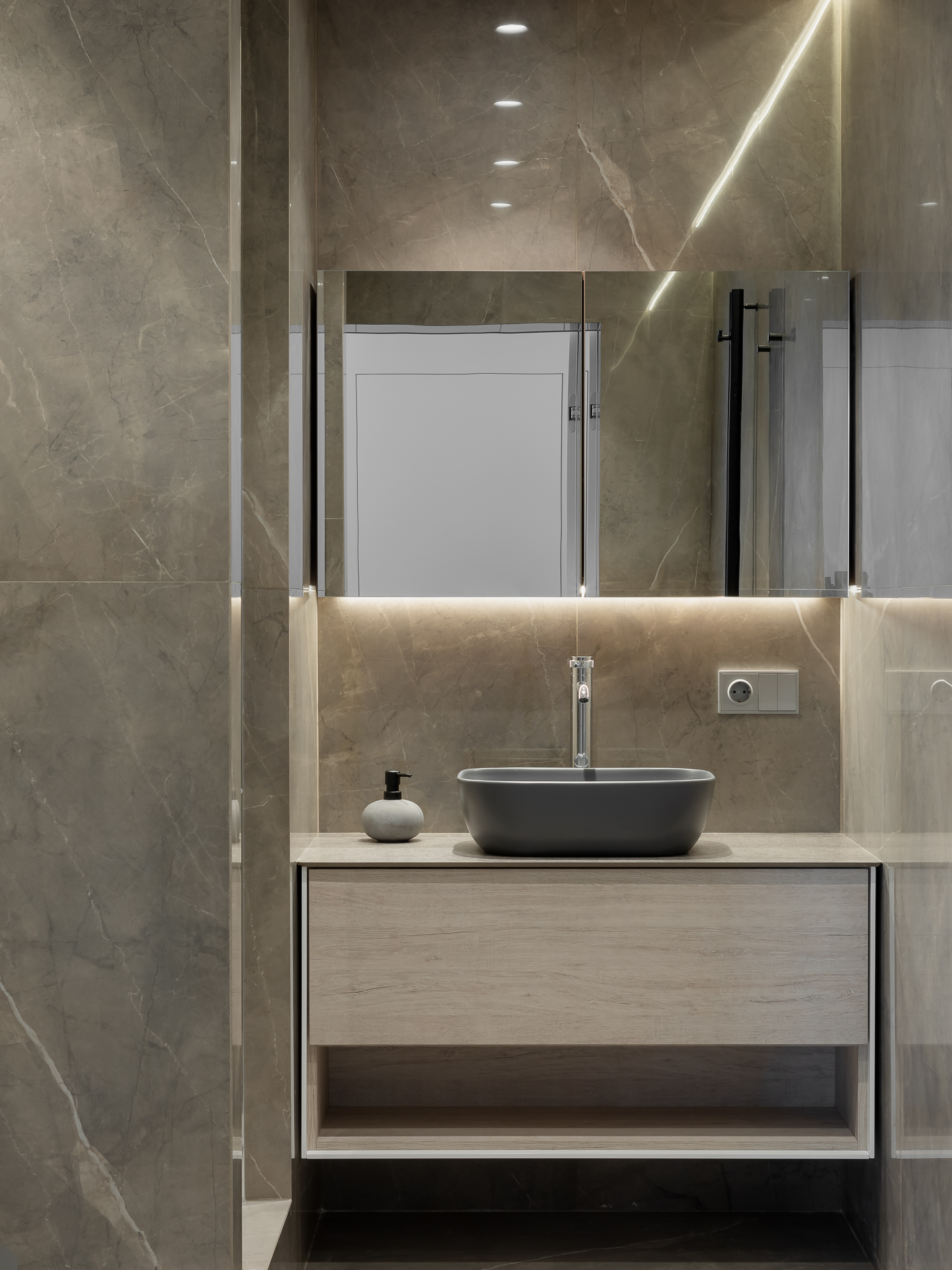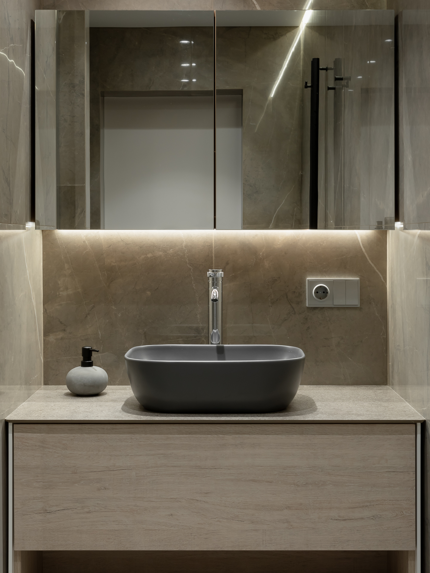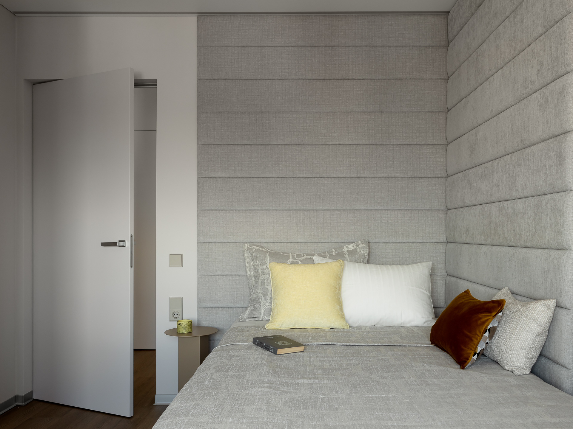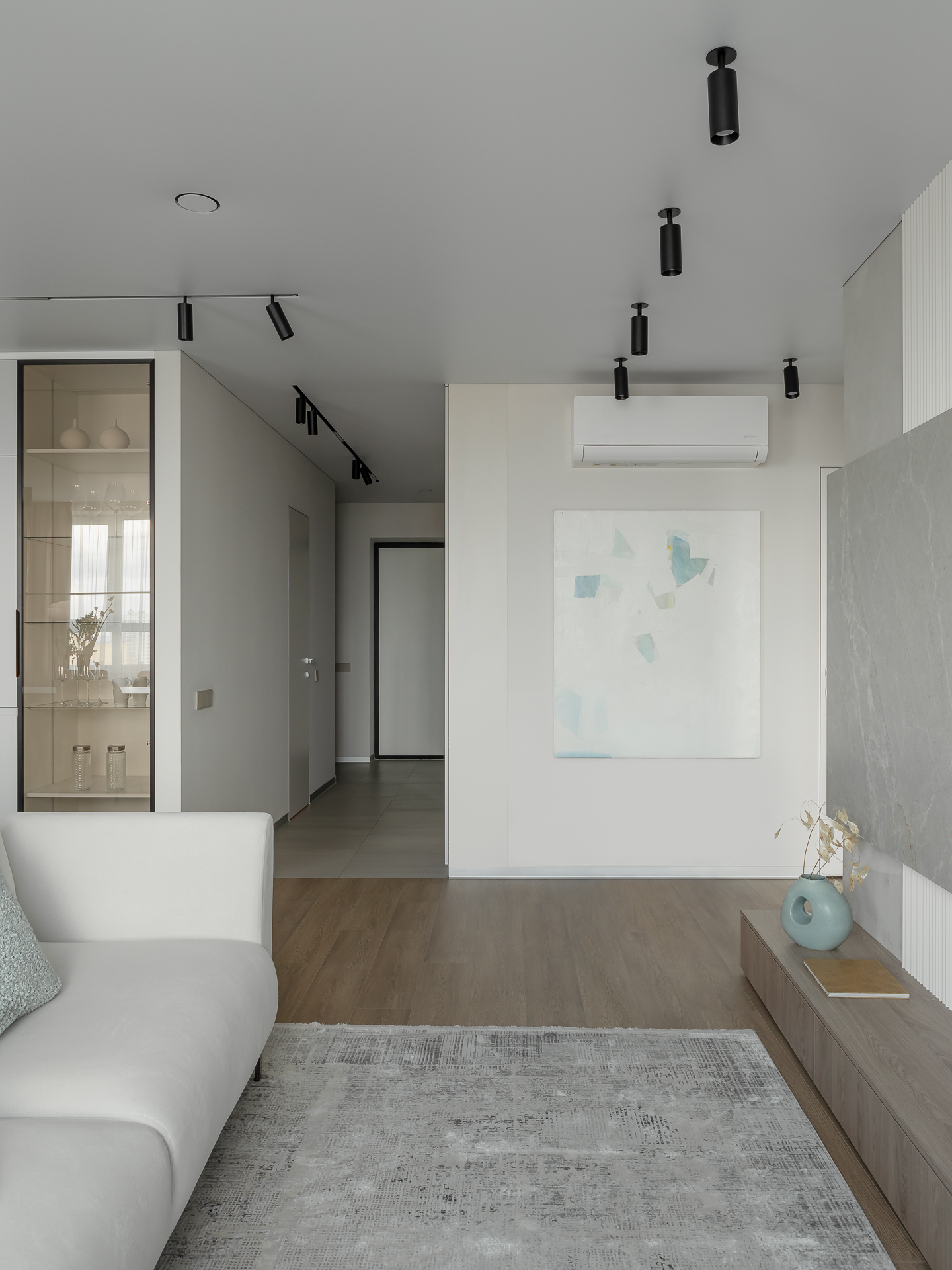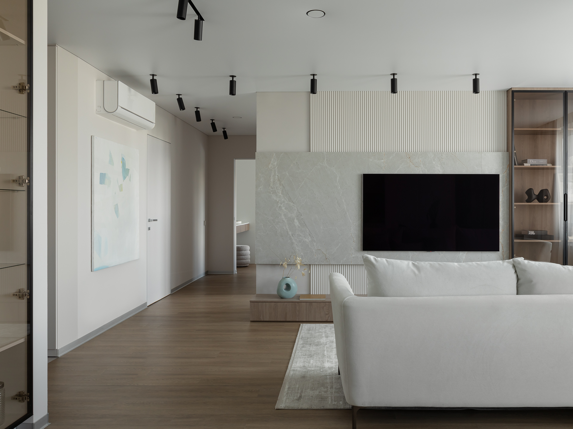 В проекте представлены электроустановочные изделия Donel R98 в цвете матовый карбон и матовый кашемир.